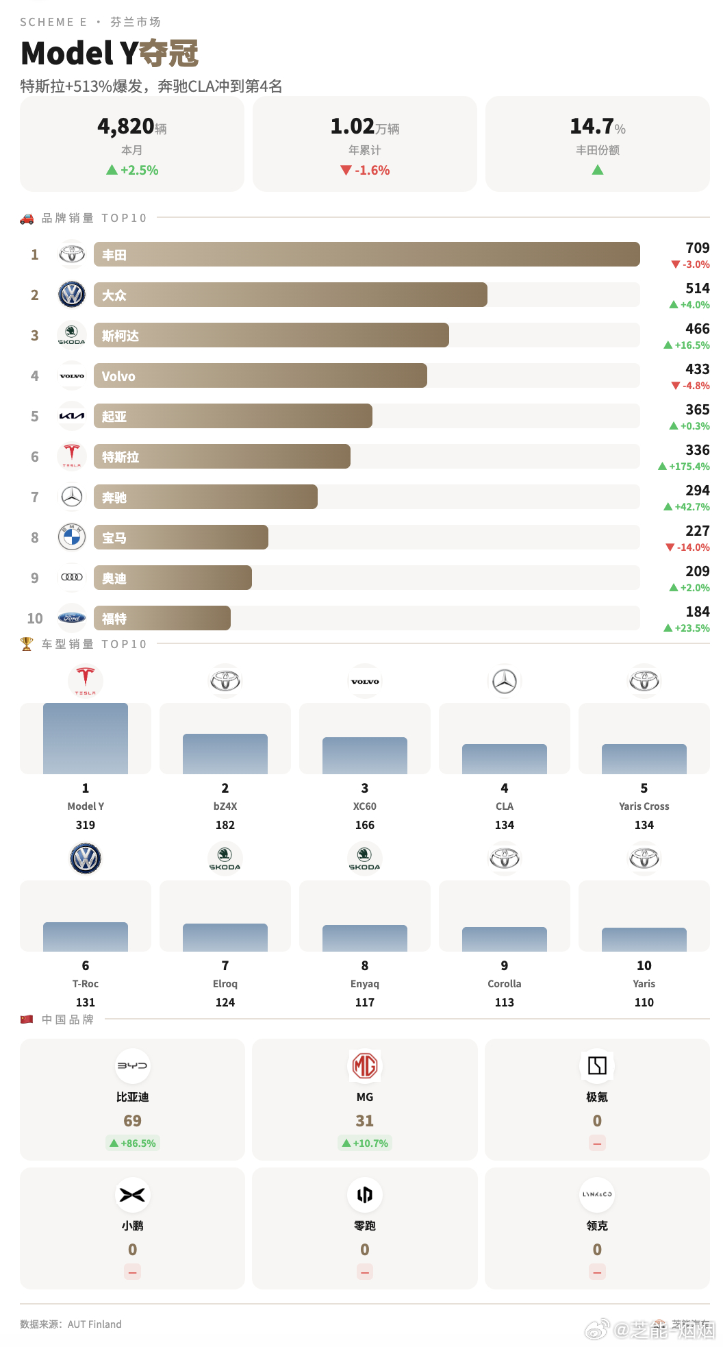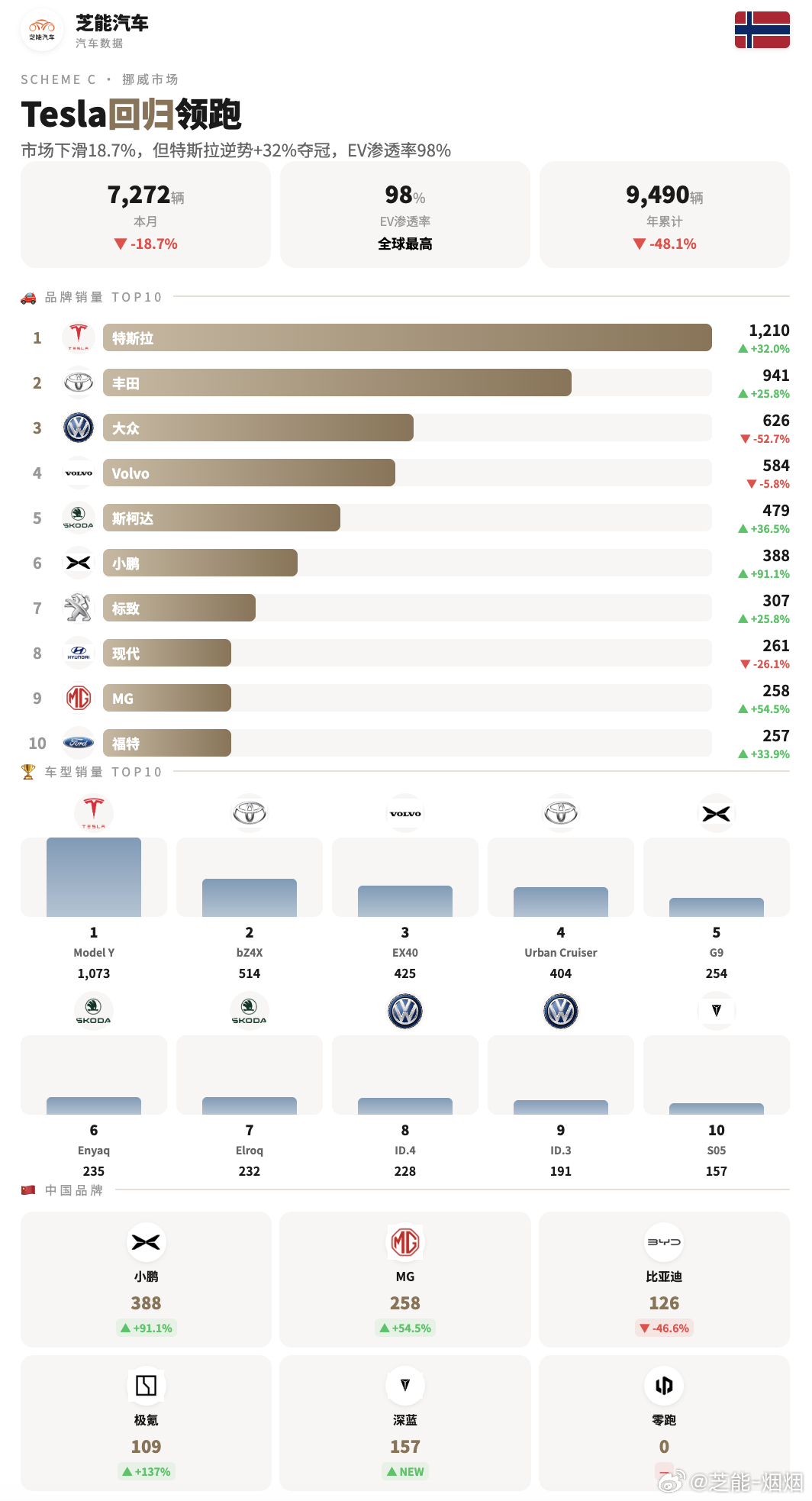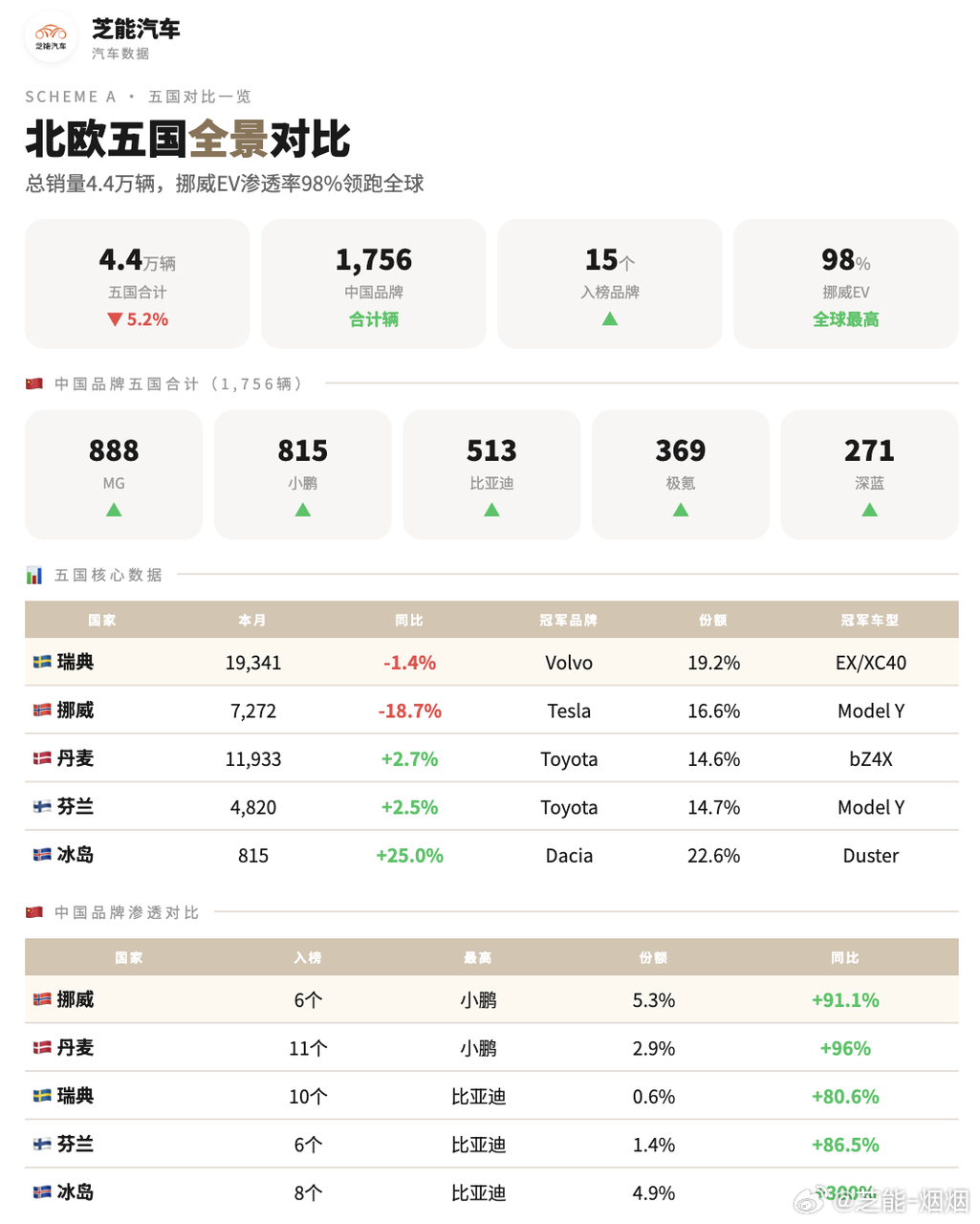 中国品牌在北欧稳步突围,多家车企实现高增长,名爵、小鹏销量领先,比亚迪、极氪、深蓝等也交出不错成绩,高端电动市场竞争力不断提升。
