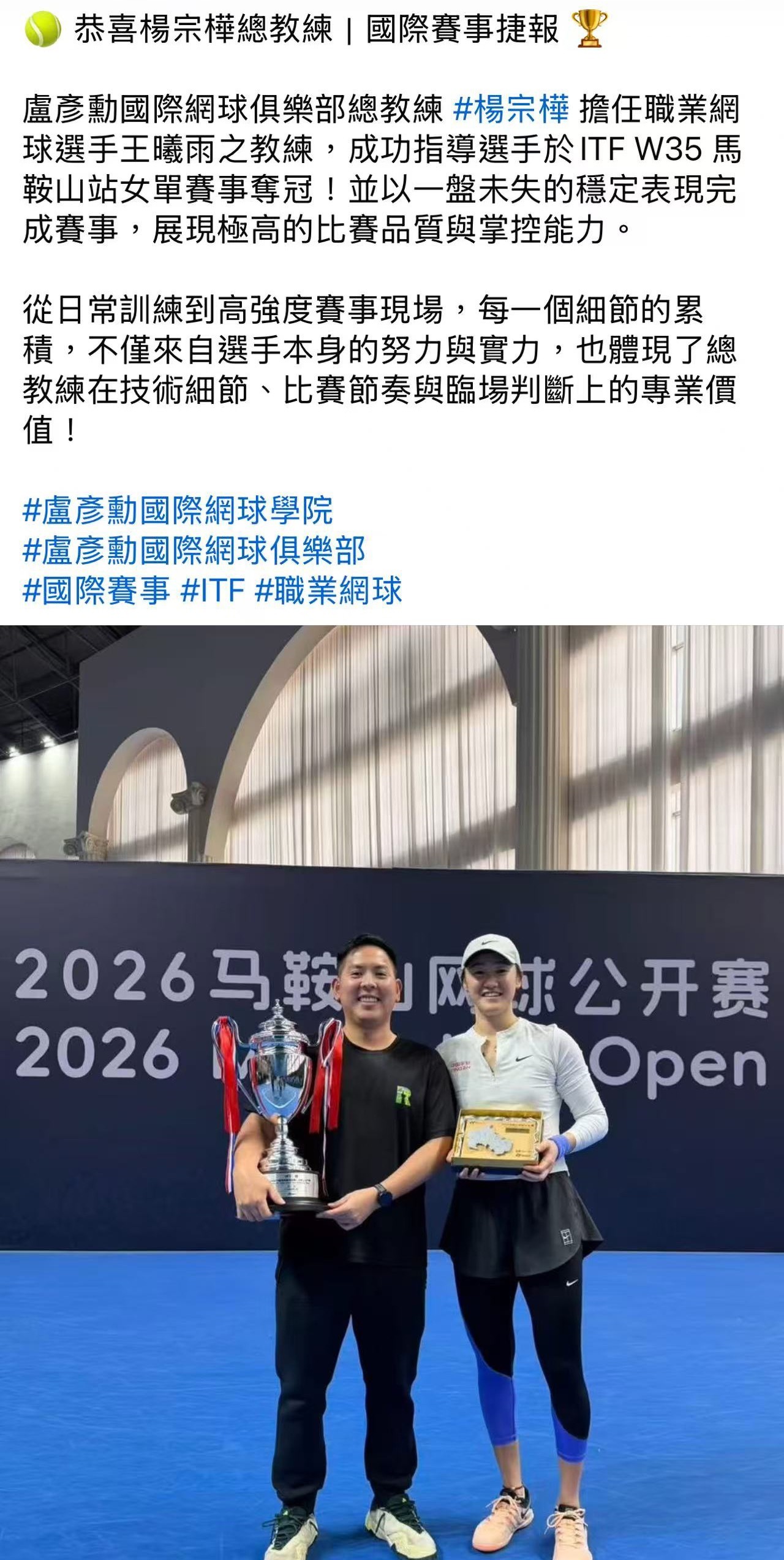 杨宗桦还是卢彦勋国际网校的总教练呢。卢哥这些年在大陆发展不错呀!wta
