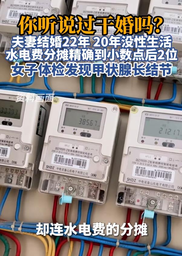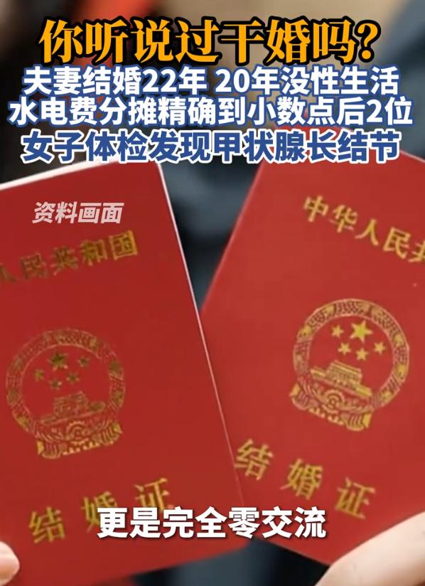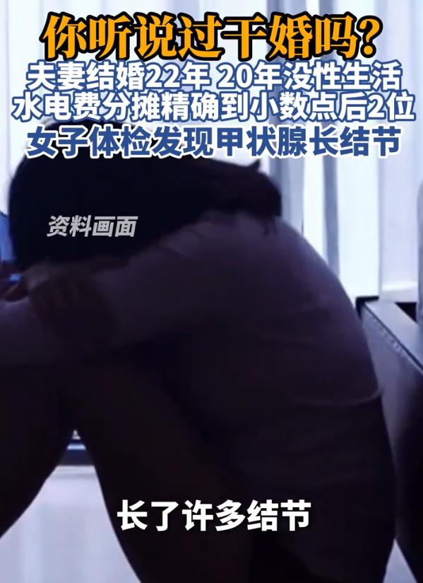 “这种婚姻有什么意义?”女子结婚22年,其中20年都是“干婚”,夫妻俩人虽然同住在50平米的房子里,却几乎无交流,更别说夫妻夫妻生活,就连水电费都要分摊,具体到小数点后两位,直到女子查出甲状腺结节,才意识到这种生活对自己影响有多大 你有没有想过,一段婚姻能“安静”到什么程度?不是那种相濡以沫的默契,也不是吵吵闹闹后的和解,而是两个人住在同一个屋檐下,却像两个合租的室友,甚至连室友都不如 女子和丈夫是经人介绍认识的。那会儿年纪到了,条件看着合适,相处起来也没啥大毛病,就顺理成章结了婚 刚结婚那两年,日子还算正常。一起做饭、一起吃饭、偶尔拌两句嘴,再和好,柴米油盐里也掺着点小甜蜜。和大多数普通夫妻一样,他们也曾有过那种“好好过日子”的盼头 但不知道从什么时候开始,事情悄悄变了味 没人吵架,没人摔门,甚至没人红过脸。但同样,也没人说话了,没人靠近了,没人再主动问一句“你今天累不累” 夫妻生活?早就没了。谁也没提,谁也没主动打破这个沉默。就这么稀里糊涂地,一天天过下去 他们住在一套50平米的小房子里。空间不大,却硬生生装下了两个互不打扰的世界 早上,两个人先后起床,各吃各的早餐。一个出门上班,另一个也出门。晚上回来,一个窝在沙发上看电视,另一个钻进卧室看书追剧。明明是夫妻,却像两条平行线,靠得再近,也不会有交点 就连水电费,都是分摊的。精确到小数点后两位,你一半,我一半 22年的婚姻里,有20年都是这种状态,甚至有2年更是几乎零交流。直到那天,她去医院做了个体检 报告出来,她身上长了很多结节。医生看着报告,很直接地告诉她:这跟你长期压抑的情绪有很大关系 那一刻她终于明白了:这种看似“和平”的婚姻,其实是一个无形的牢笼。它不吵不闹,不摔东西不动手,但它一点一点消耗着你的气血、你的精神、你对生活的热情 回到家,她提了离婚。 丈夫没有挽留,没有犹豫,甚至没有任何情绪波动。当场就同意了 说实话,看到这样的事,心里有些不是滋味,不是因为她最后离了婚,而是因为她花了整整20年,才意识到自己的问题 两个人还住在一起,还顶着夫妻的名分,甚至在外人眼里还是“挺好的两口子”。可实际上,不说话、不交流、不亲近,连最基本的关心都没有。你说这是婚姻?我觉得连搭伙过日子都算不上。搭伙至少还有个“伙”字,是一起吃饭、一起分担。他们呢?连水电费都各付各的 这一看,有时候,结束一段错误的关系,不是失败,是止损。毕竟,比起一个人过,更可怕的,是两个人在一起,却比一个人还要孤独 夫妻22年婚姻20年无性生活 水电分摊