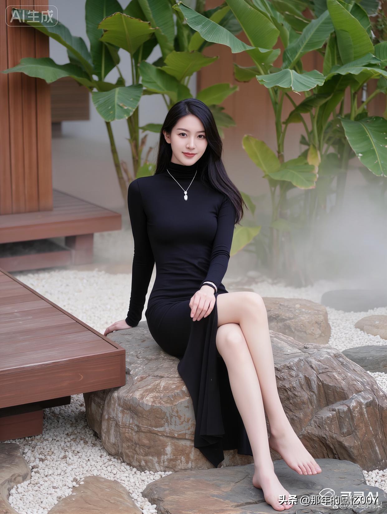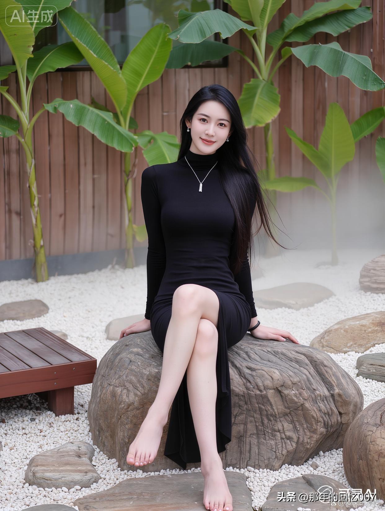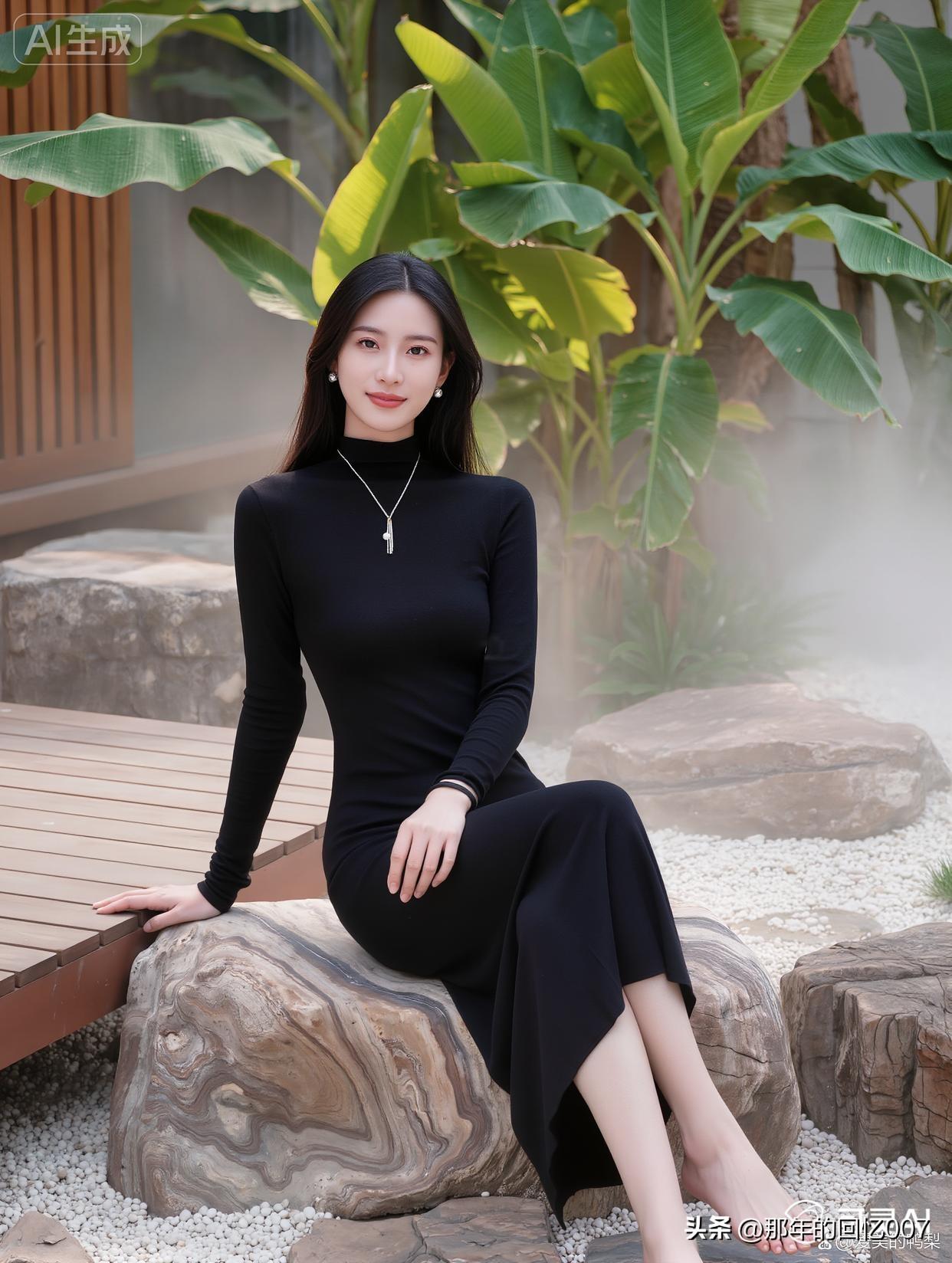 看到“黑衣美人倚绿植,静待春风拂面来”,脑海里瞬间浮现出一幅绝美画面。就像杨超越
