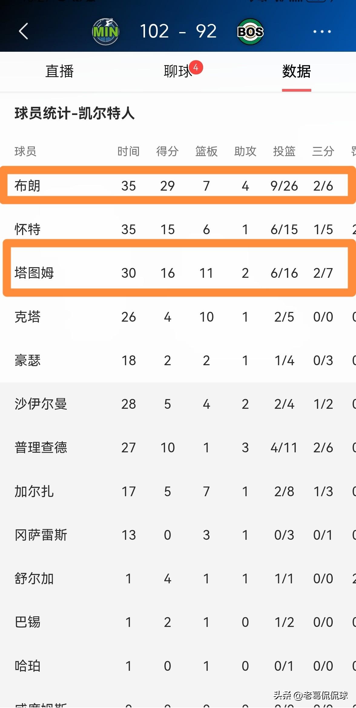 凯尔特人球星塔图姆真是讨厌死杰伦-布朗了!今天凯尔特人在主场以92:102爆冷不敌缺少爱德华兹的森林狼,本场比赛塔图姆首发出战30分钟,投篮16中6,其中三分球7中2、罚球3中2得到16分11篮板2助攻2抢断。虽然本场比赛塔图姆的表现不好,但是杰伦-布朗的表现更加拉胯,杰伦-布朗完全是球队输球的罪魁祸首。 在比赛结束以后,当塔图姆看到布朗的数据统计时,我相信塔图姆一定讨厌死布朗了。如果不是布朗的发挥失常,凯尔特人怎么会爆冷输给森林狼呢?