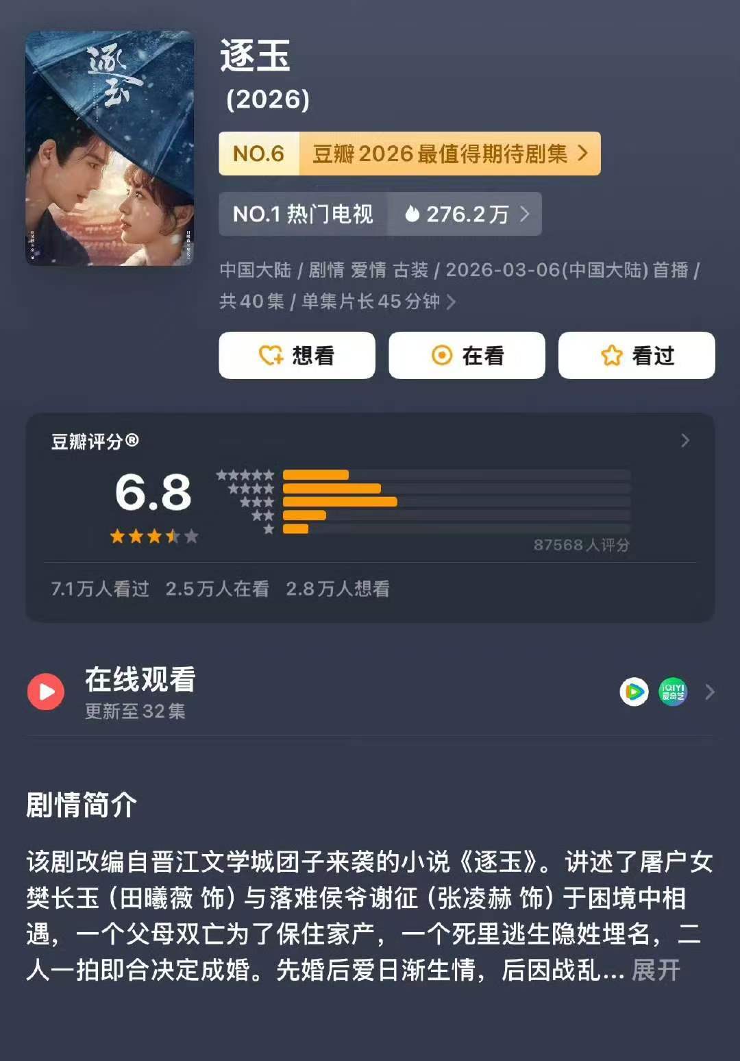 逐玉8.7w人打分逐玉打分人数逐玉打分人数 八万多人的话是爆剧的正常打分人数吗