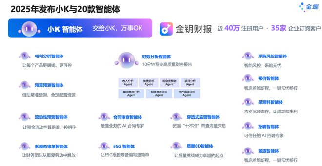 2023年发布苍穹GPT和财务管理大模型,2024年发布了AI管理助手,为财务、人力、采购、开发等多个业务场景提供个性化智能解决方案。2025年提出要成为"企业管理AI公司",并将品牌从"金蝶云"升级为"金蝶AI",推出国内首个企业级AI原生超级入口"小K"和近20款独立智能体。