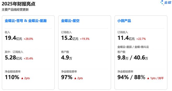 分业务线看,大企业产品苍穹与星瀚收入19.4亿元,同比增长28%,净金额续费率110%。中型企业星空订阅收入15.2亿元,续费率97%。小微产品订阅收入增长22.7%。三条线全线健康增长,说明客户粘性正在加固。