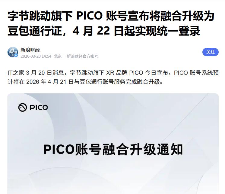 字节“豆包宇宙”再添一猛将! 据了解,近期字节跳动旗下 XR 品牌 PICO 正式宣布,其将在 2026 年 4 月 21 日与豆包通行账号服务完成融合升级。   未来除PICO 账号会统一升级为豆包通行账号外,升级完成后的用户也可使用该手机号登录所有支持豆包账号的产品及服务,如豆包 App、PC 端、网页端、插件端等。