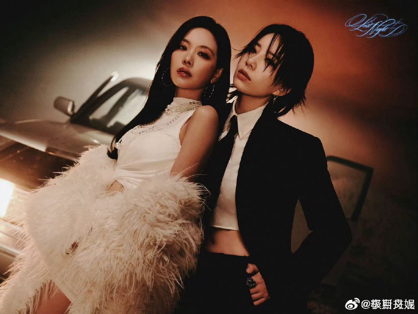 李斯丹妮王霏霏错位合照一个角度,一次定格,黑白色调把氛围感拉到极致,两人同框又飒