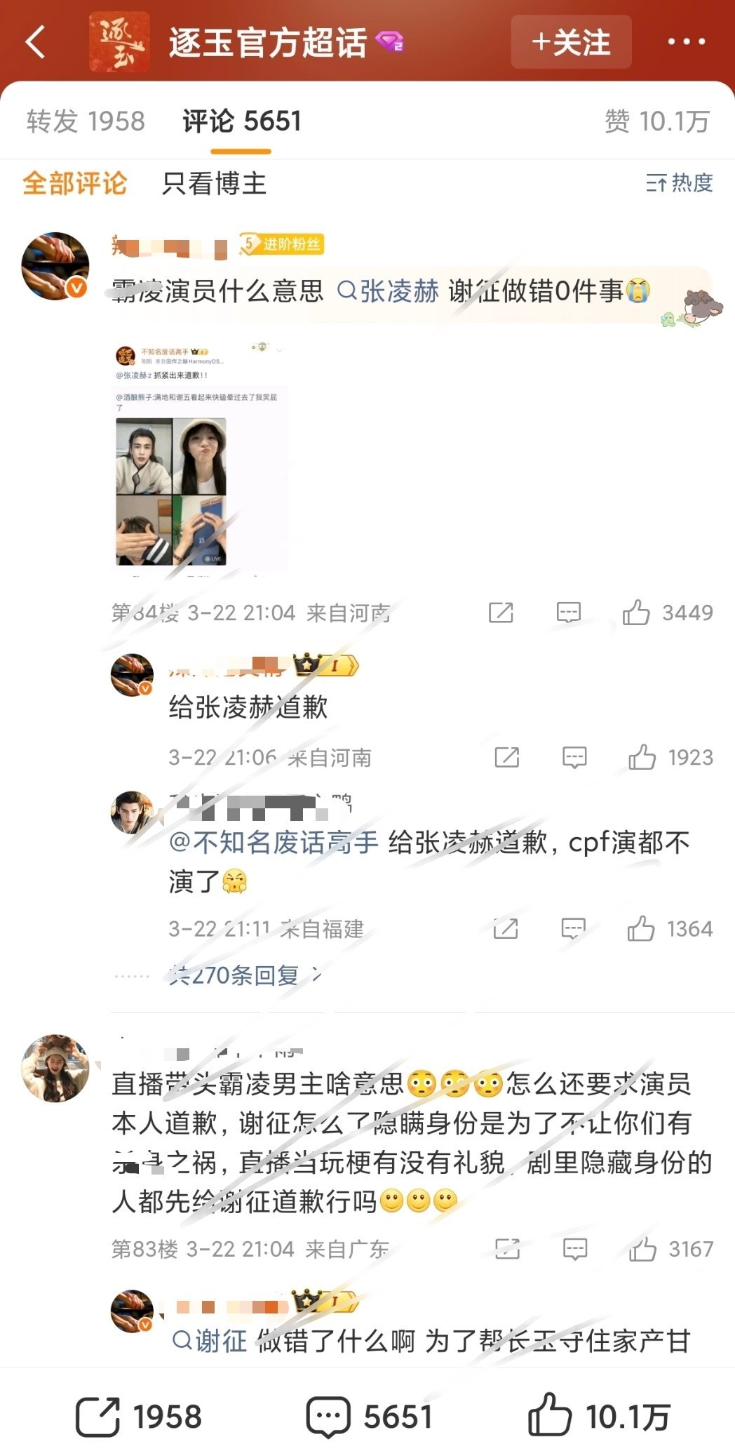 《逐玉》这是怎么了? 张凌赫、田曦薇昨天连线直播,现在小核桃在官博下面维全,要求女主和剧方给🐮道歉。。。逐玉豆瓣6.8