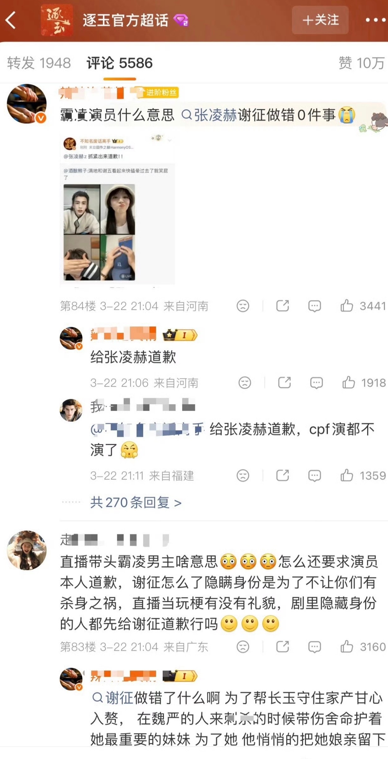 逐玉官博前排张凌赫粉丝要求田曦薇和其他主演给张凌赫道歉昨天直播咋了?
