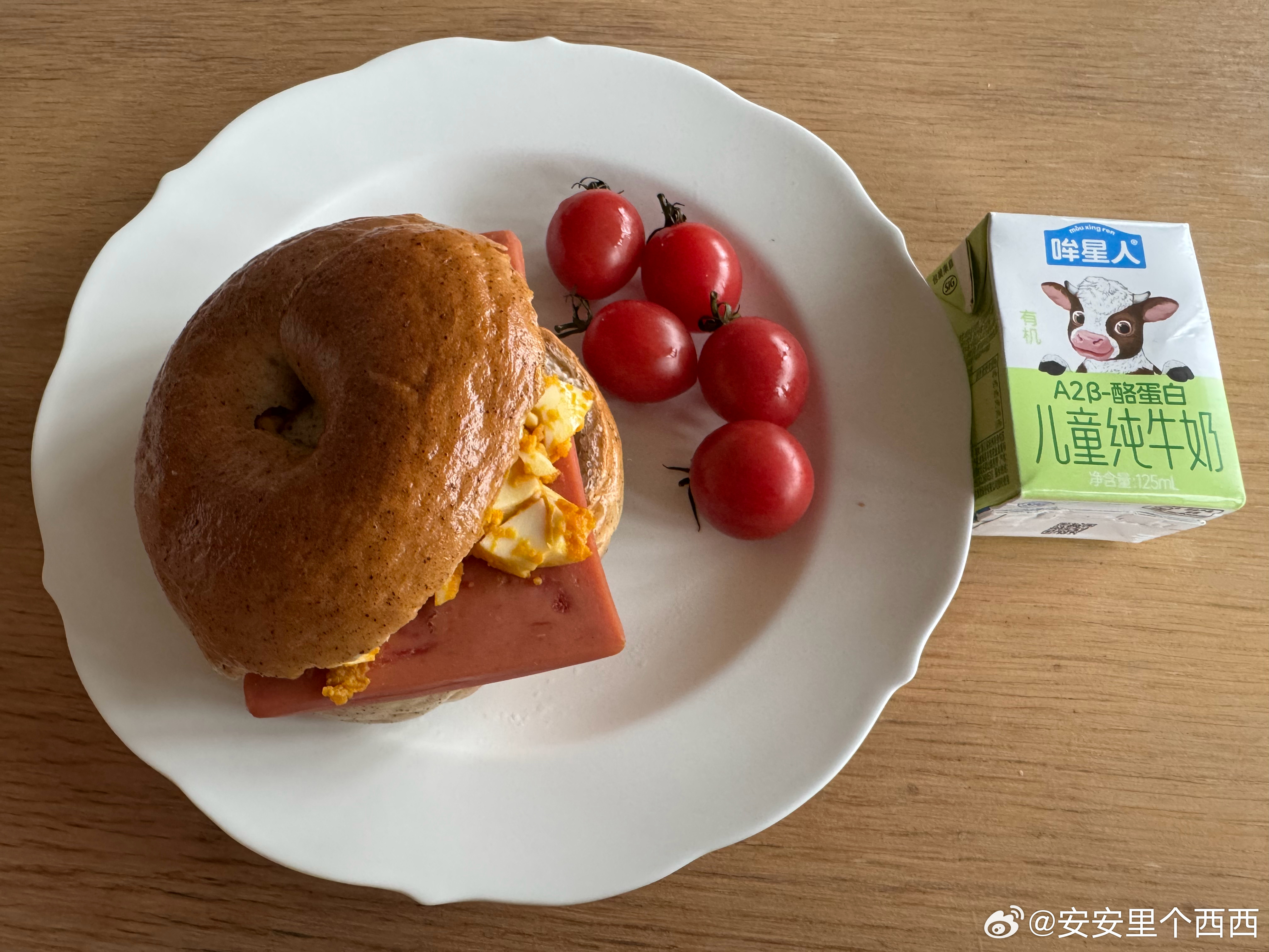午饭比较糊弄,不过挺好吃贝果是上周参加活动送的口感还不错配料是午餐肉和我爱的酱油蛋就是水煮蛋酱油里滚一滚保证蛋黄蘸上酱油就会好吃酱油还必须是薄盐生抽