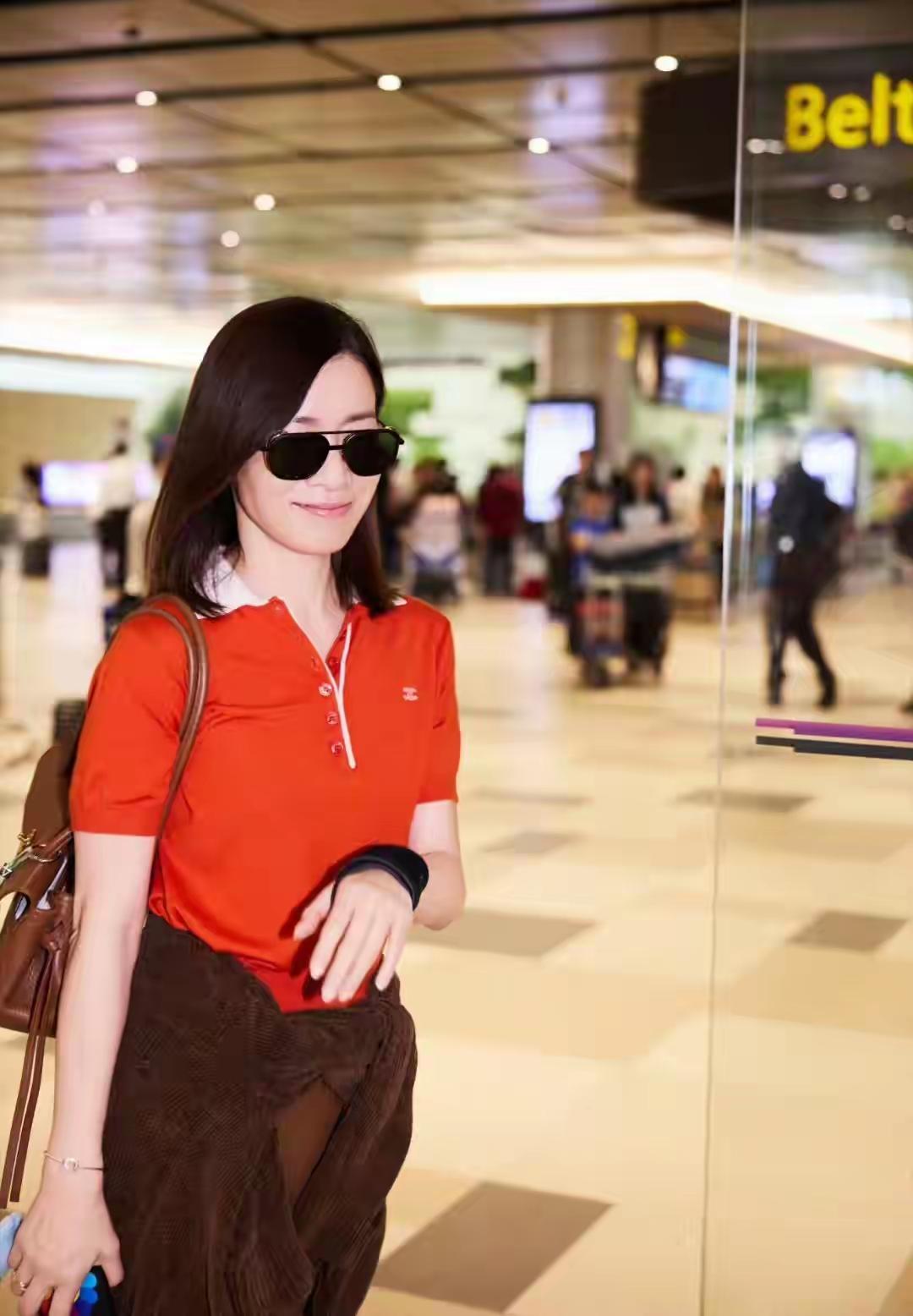 路人镜头下的佘诗曼状态惊艳!她身穿橘红Polo衫搭配棕色阔腿裤,腰间随意系着针织