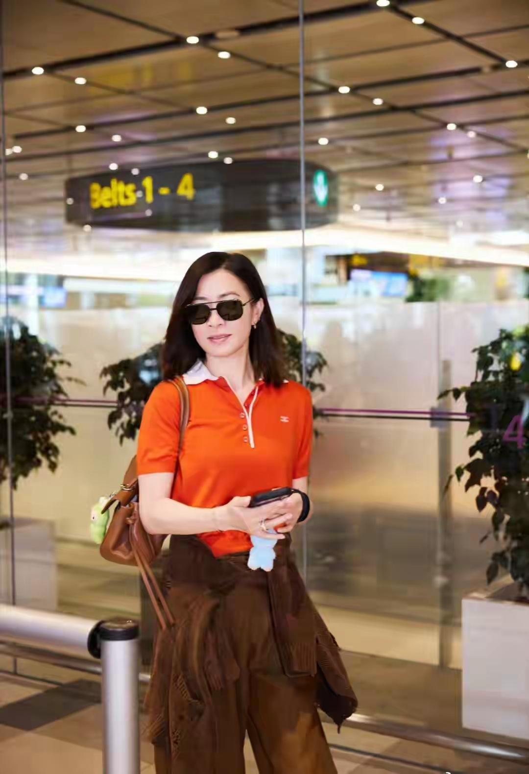 路人镜头下的佘诗曼状态惊艳!她身穿橘红Polo衫搭配棕色阔腿裤,腰间随意系着针织开衫,造型随性时髦。墨镜下笑容温柔,50岁依然体态舒展,尽显港星独有的松弛感。