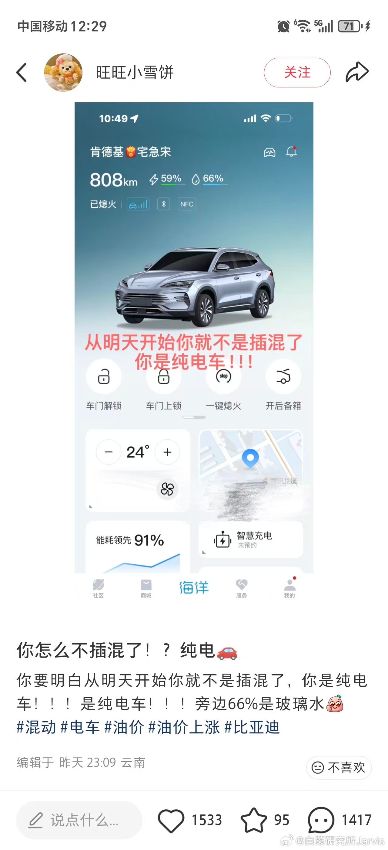 自从买了插混,每天都在拷问自己,为什么当时不直接上纯电直到油价破9,不反问了,你就是纯电车!一天一充、两充、甚至三充,反正劳资就是不用油大v聊车