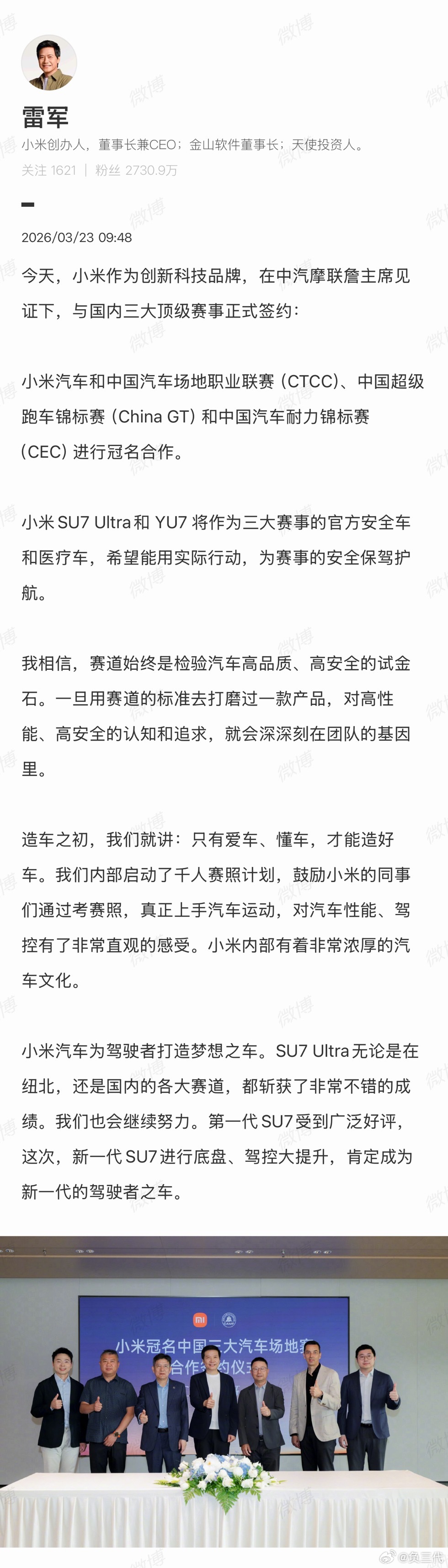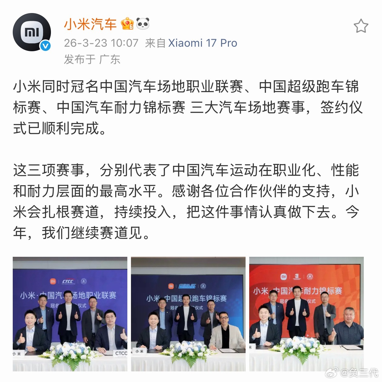 小米与三大顶级赛事签约今天小米与国内三大顶级汽车赛事:中国汽车场地职业联赛、中国超级跑车锦标赛、中国汽车耐力锦标赛 完成冠名签约。这三大赛事分别代表中国汽车职业化、性能、耐力上的最高水平