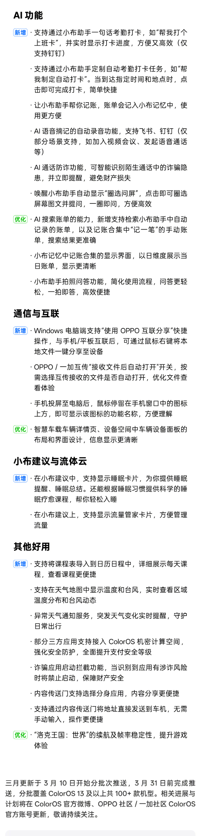 ColorOS 16三月份更新升级一览,包括AI功能、通信互联还有小布建议、流体云等等,都迎来了更新,依然是分批推送的模式,官方公布的时间是5月31日之前完成覆盖ColorOS 13及以上共100余款机型,覆盖机型还是非常丰富的,具体大家可以对照图片看下自己用的手机在不在里面