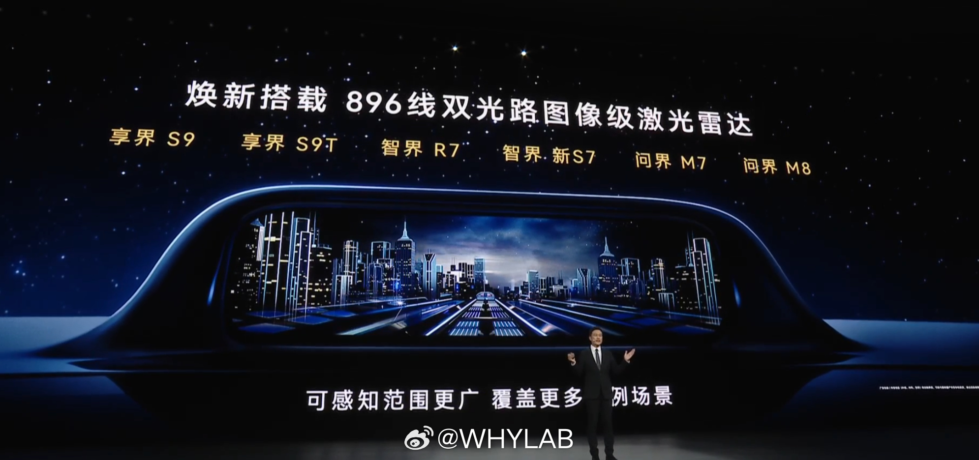 享界 S9T、享界 S9、智界 R7、智界新 S7、问界 M7、问界 M8 焕新搭载 896 线双光路图像级激光雷达。