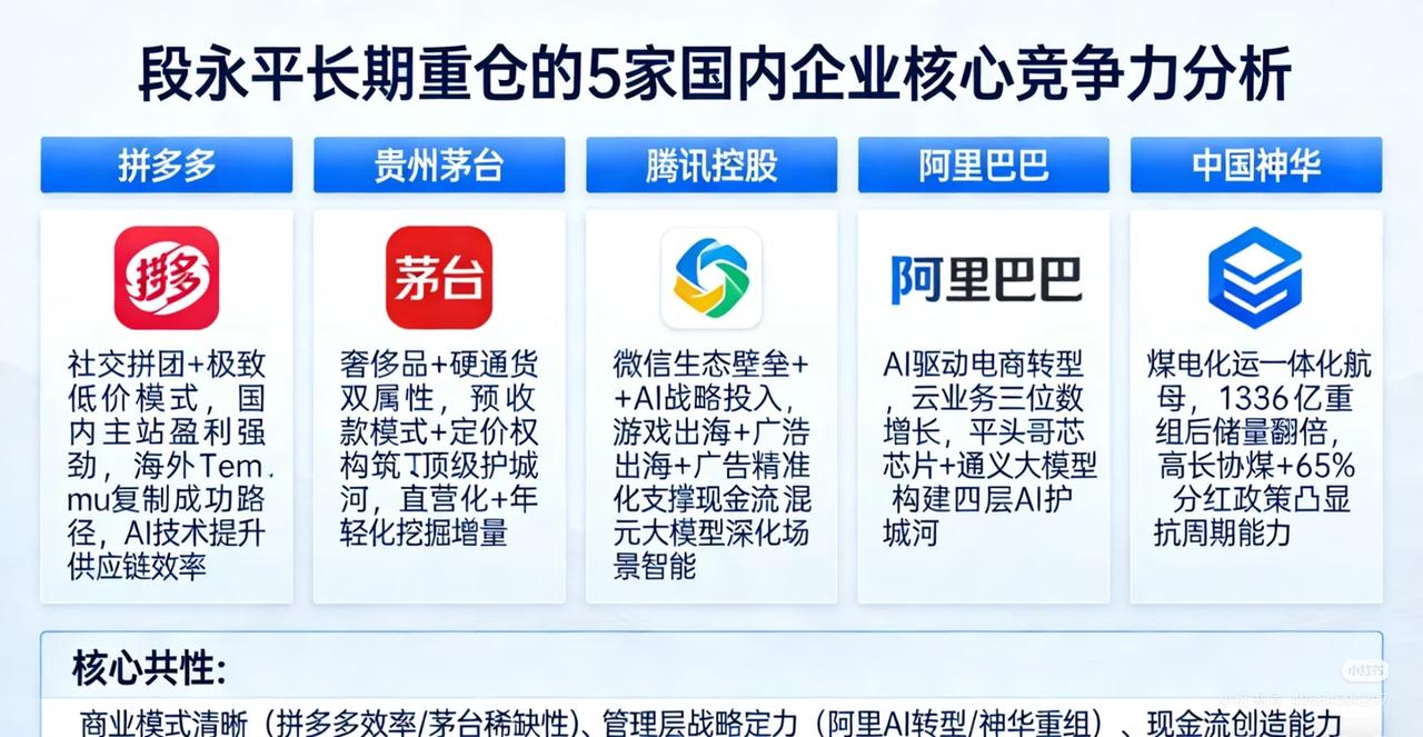 揭秘段永平长期重仓5家核心企业,普通人抄作业关键看这3点! “股神”段永平长期重仓的5家国内公司曝光,不是盲目跟风,而是聚焦清晰商业模式+强现金流+强管理层三大核心! 拼多多凭社交拼团+低价模式,Temu海外复制成功,AI提升供应链效率;贵州茅台手握稀缺定价权,直营化挖掘增量;腾讯靠微信生态+混元大模型筑牢护城河;阿里以AI驱动电商与云业务转型;中国神华作为煤电化运航母,高长协煤+高分红抗周期。 这5家公司核心共性极强,普通人不必盲目重仓,但可借鉴选股逻辑,不追热点、抓现金流与商业模式,长期持有方能稳赚不赔! 段永平 价值投资 贵州茅台 腾讯控股 阿里巴巴