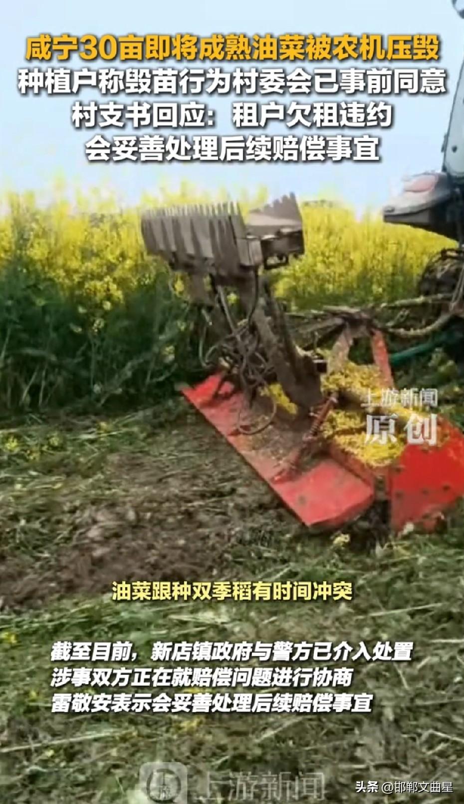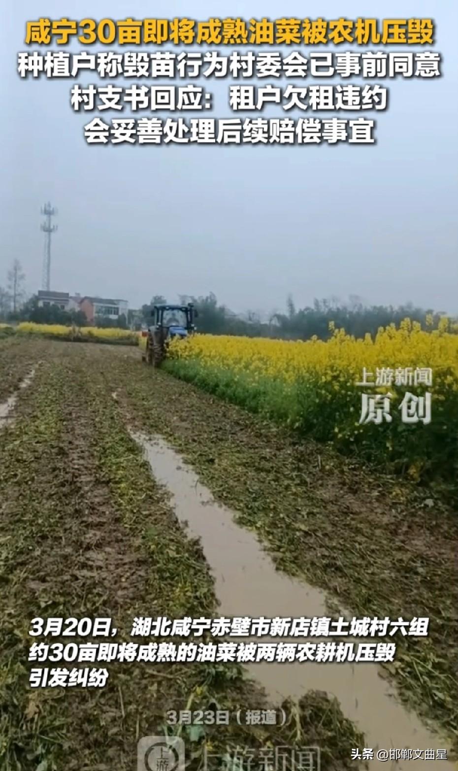 太心疼了!30亩即将成熟油菜被农机直接压毁,农民半年心血全白费 近日,湖北咸宁赤壁,约30亩眼看就要收割的油菜,被两台农机开进田里直接碾平,金黄一片全被压断,农户当场崩溃。 据媒体报道称,这片高标准农田因土地租金纠纷,承租方未按时交租,村委协调无果后,同意新承租方进场备耕,直接用农机毁掉即将成熟的油菜。 农户表示事前没收到正式通知,等发现时庄稼已面目全非。目前双方已就赔偿展开协商。 这事经媒体报道后,引起网友们热议。 有网友说,看着快熟的油菜被压,农民心都在滴血,太糟践粮食了。 还有网友说,租金纠纷可以走法律程序,不该拿庄稼撒气,太粗暴。 还有网友说,农时不等人,但也该先沟通赔偿,不能说毁就毁。 农民种地有多难,只有种过的才懂。 从播种到管护,半年风吹日晒,就盼着收成换点钱,结果一句话、一台机器,说毁就毁掉了。 说句实在话,纠纷归纠纷,庄稼是无辜的,农民的心血更不该被随意践踏。 对此,大家怎么看?