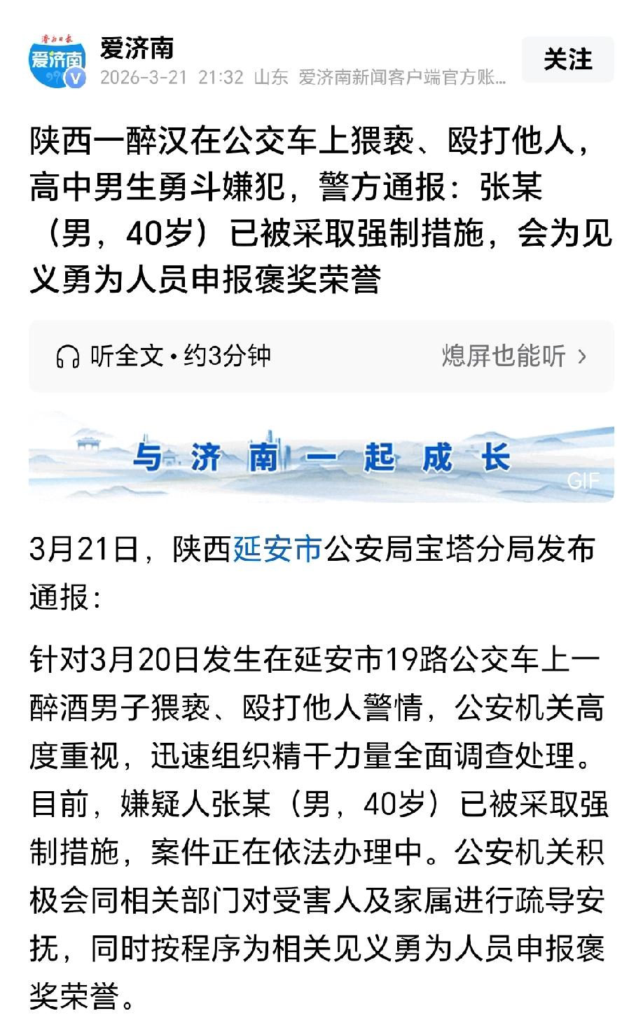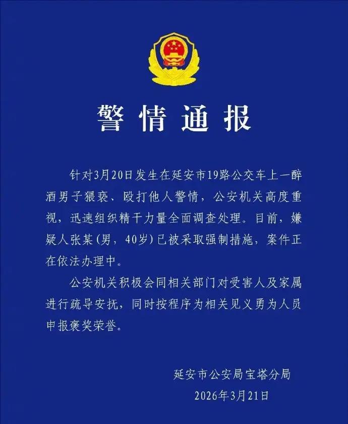 陕西延安,男子借着酒劲,在公交车上对一初中女孩动手动脚,女孩出言制止,结果男子竟然动手殴打女孩。一旁的高中男生看不惯,上前制止男子,还主动帮女孩报警。男子眼看讨不到好处,就要下车溜走,不料被男孩按倒在地,坐等帽子叔叔的到来。目前,男子被采取了强制措施,男孩也被有关部门申报见义勇为奖。 3月20日,19路公交车正沿着熟悉的路线缓缓行驶,车厢里挤满了通勤的乘客,大多是低头刷着手机的上班族,还有背着书包的学生,一切都透着日常的平静。 40岁的男子张某挤上了车,身上带着浓重的酒气,走路都有些晃悠。 他醉眼迷离地扫视着车厢,目光最终落在了一名初中女孩身上,她正抓着扶手,回味着手里的课本。 张某晃晃悠悠地走到女孩身边,借着酒劲,伸出手就往女孩的胸部乱摸,动作轻浮又放肆。 女孩被这突如其来的骚扰吓了一跳,猛地往后缩了缩身子,强压着恐惧,呵斥着男子:你干什么!离我远点! 女孩的呵斥声在嘈杂的车厢里格外清晰,周围的乘客纷纷投来目光,却又都碍于情面不敢多言。 可张某不仅没收敛,反而被女孩的话激怒了。 张某脸色瞬间涨得通红,酒劲上头的他抬手就朝女孩的脸上扇了过去,“啪”的一声脆响,女孩被打得悄悄站在角落,只敢默默的流眼泪。 就在这危急时刻,女孩斜前方的一名高中男生猛地站了起来。他看着张某嚣张跋扈的样子,又看看女孩脸上的泪痕,心里的怒火“蹭”地一下就冒了上来。 男孩实在看不惯这种欺负女生的行为,快步走到张某身边,厉声喝止了张某。 张某被突然打断,转头瞪着眼前的高中生,醉醺醺地还想吓唬男孩,没想到男孩并没有发怵,反而态度强硬的制止了张某。 控制住事态后,男孩第一时间拿起手机报警,还给女孩的家长打了电话,随后紧紧盯着张某,防止他再次施暴。 张某看到情况不妙,心里顿时慌了。他知道自己酒后滋事、打人、骚扰,真要是被警察抓了,肯定没好果子吃。 眼看公交车到站,张某一溜烟的冲出车门,想趁机溜走。 没想到,高中生眼疾手快,一把抓住张某的后衣领,用力一拽,又顺势将他按倒在地板上。 张某挣扎着想要起身,却被高中生死死按住,动弹不得。 大家见状,纷纷围了过来,有人帮忙按住张某的腿,有人拿出手机拍摄取证。 没过多久,警察迅速赶到现场,将张某带走。 经过调查,张某对自己酒后猥亵、殴打女孩的行为供认不讳。目前,张某已被公安机关依法采取强制措施,案件正在进一步办理中。 公安机关还按照相关程序,为这位挺身而出的高中男生申报了见义勇为荣誉称号。 这位素不相识的高中生,用自己的勇敢和担当,守护了弱小,制止了恶行,不仅让乘客们感受到了温暖,更让大家看到了少年一代的正义与勇气,也给所有人上了一堂生动的“正义课”。 依据《刑法》第二百三十七条规定:以暴力、胁迫或者其他方法强制猥亵他人或者侮辱妇女的,处五年以下有期徒刑或者拘役;聚众或者在公共场所当众犯前款罪的,或者有其他恶劣情节的,处五年以上有期徒刑。 本案中,张某在公交车这一公共场所,酒后对初中女孩实施猥亵,遭反抗后又动手殴打,属于当众强制猥亵,而且还暴力反抗压制,情节恶劣。 其醉酒不影响责任认定,已涉嫌强制猥亵罪。 同时殴打他人,还可能涉及故意伤害相关违法责任。 综上来看,张某这一次在劫难逃,他必将为自己的嚣张行为付出代价,牢狱之灾是注定要承受的。 高中男生制止不法侵害并报警,属于正当防卫与见义勇为,依法应予褒奖。