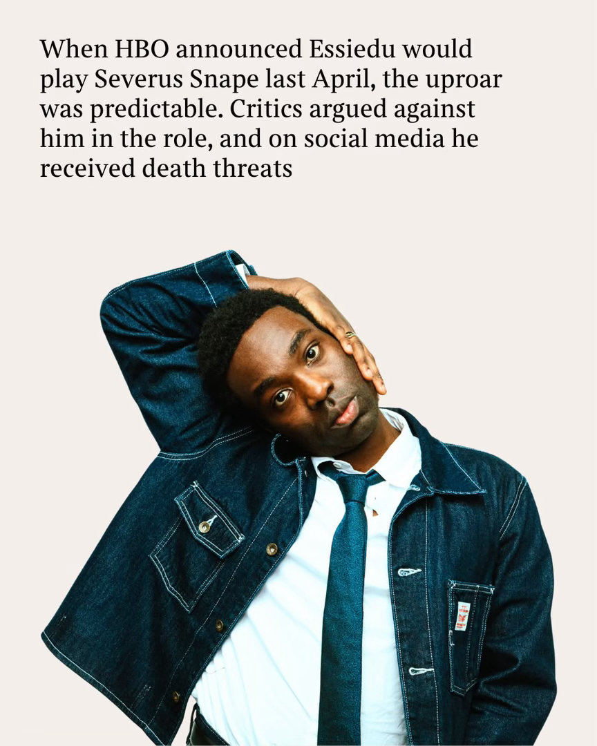 他回应了选角争议,为此还收到死亡威胁。他说道:“小时候,我会想象自己骑着扫帚飞天,在霍格沃茨上学。想到像我这样的孩子能在那个世界里看到自己的影子?这给了我莫大的动力,让我无所畏惧。”他还表示:“那些谩骂激励着我,让我更有激情去把这个角色变成我自己的。”此外,他坦言:“我并非一个35岁男人该有的楷模,但我正在尽力而为。”