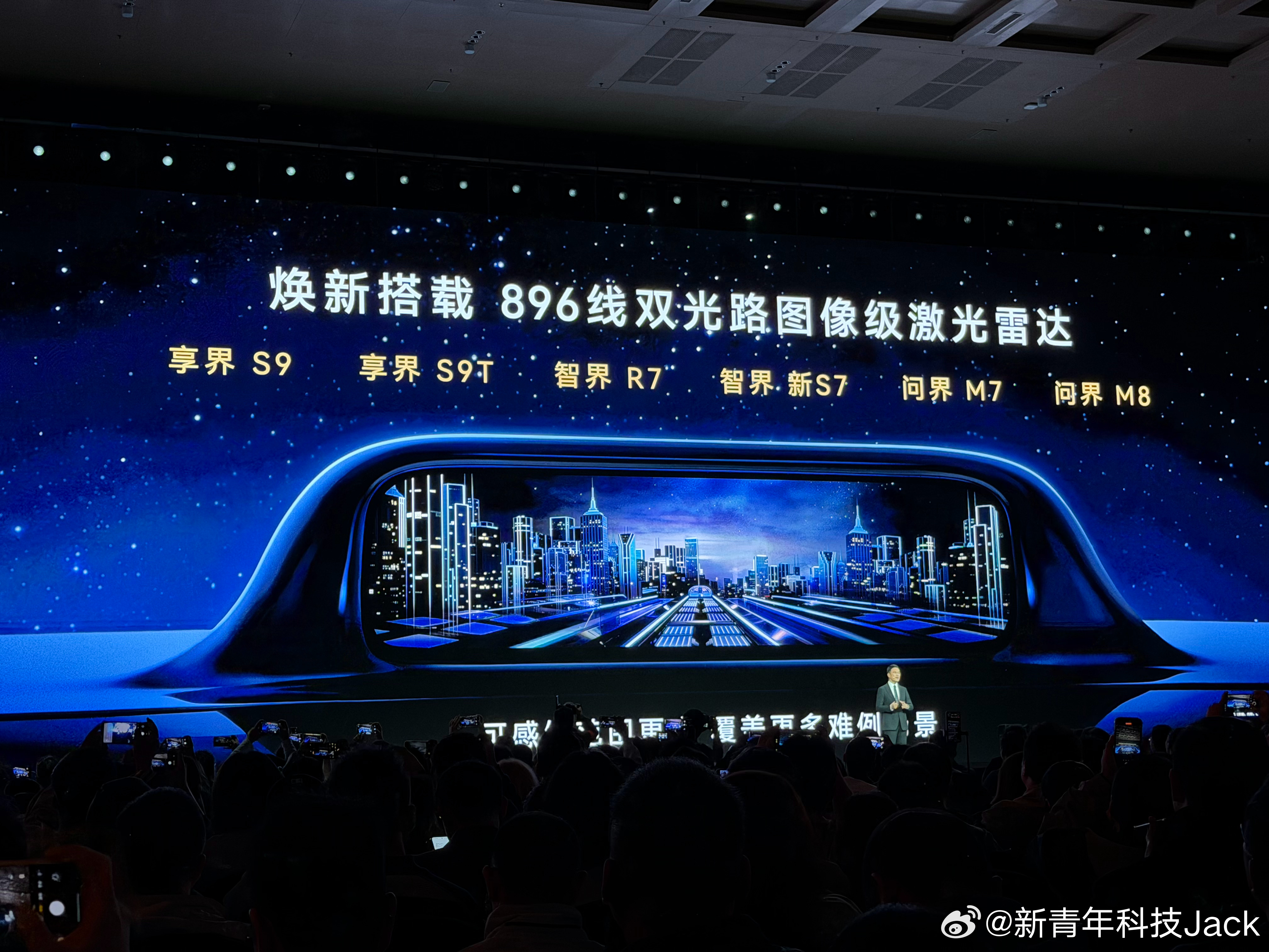 华为发布会焕新的享界S9和S9T、智界S7和R7、问界 M8、问界 M7登场,全系都有896线激光雷达,还有新的车漆上新。