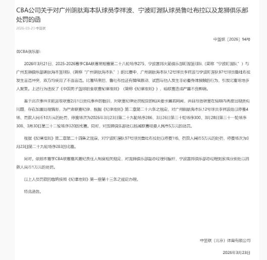 宣布了!CBA重罚李祥波和鲁吐布拉等人,共禁赛五场,罚款22万。在广州队与宁波队