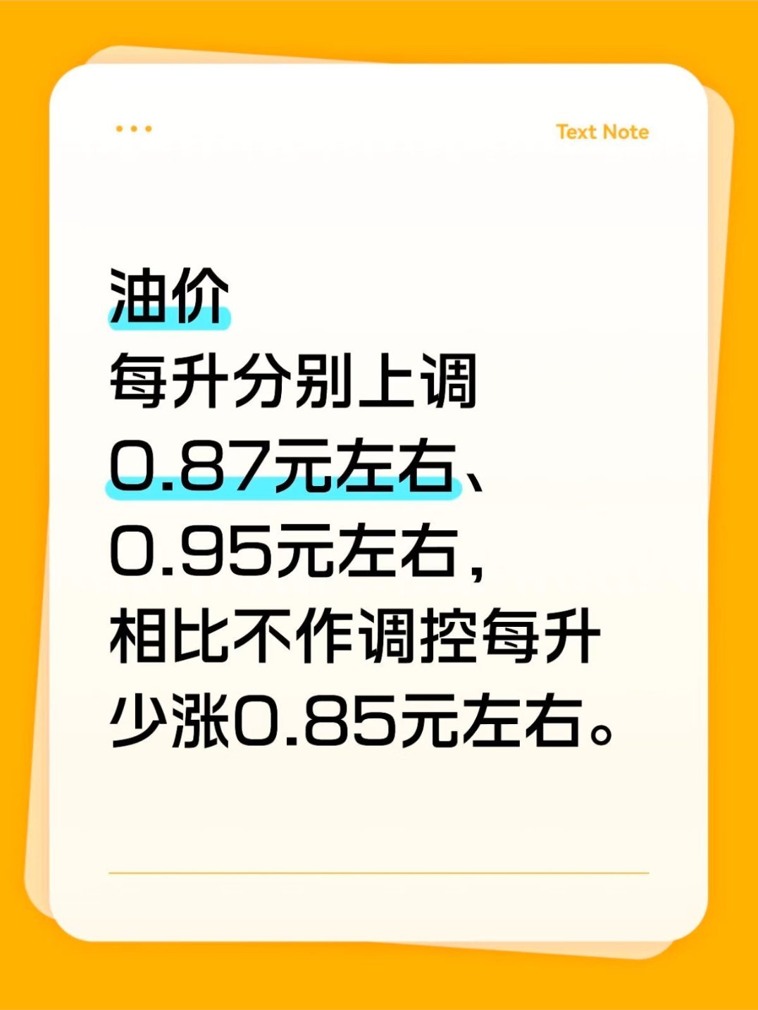 对国内成品油价格采取临时调控调整后汽、柴油价格每升分别上调0.87元和0.95元左右,相比不作调整每升少涨0.85元,加一车油下来也能省不少的钱~