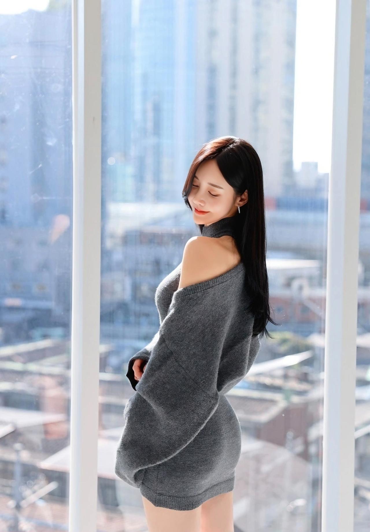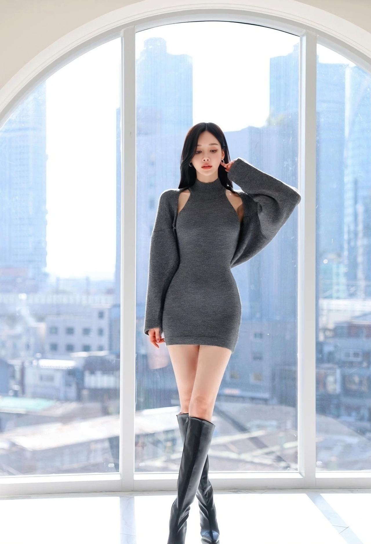 都市少女风,灰色毛衣连衣裙,都市时尚穿搭