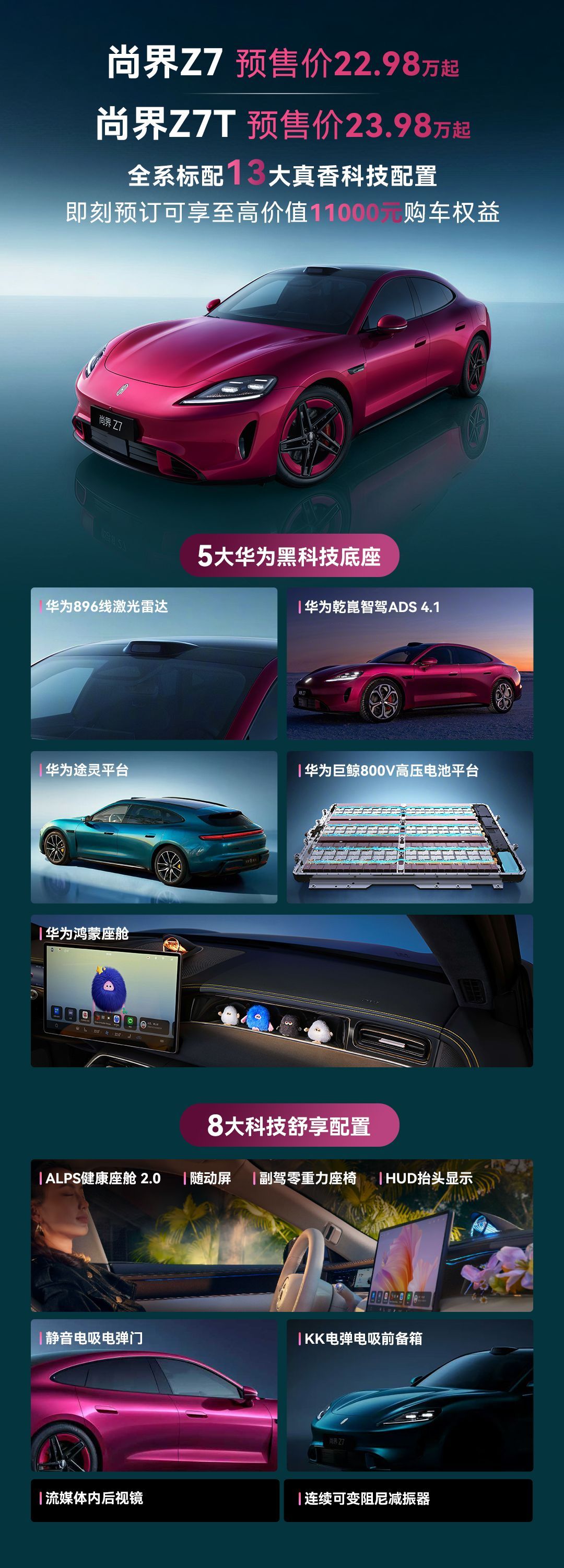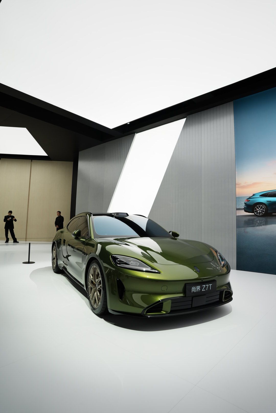今天发布会上,尚界Z7、Z7T第一次以实车身份登场。Z7用经典的低趴宽肩长车头,轿跑姿态拿捏住了;Z7T的掀背设计加上大倾角D柱,猎装车的优雅感也出来了。实车看起来比例舒展,视觉效果比图片更饱满~尚界Z7双车开箱首发轿跑专属电光紫粉,猎装专属晚山新绿,连专属色都给你分好了。5C2B涂装工艺加百万级豪车清漆,质感确实在线。再选装个追风运动套件,不光看着动感,还能梳理气流、稳车身、省能耗。这一套下来,个性跟实用都安排明白了。尚界Z7实车亮相