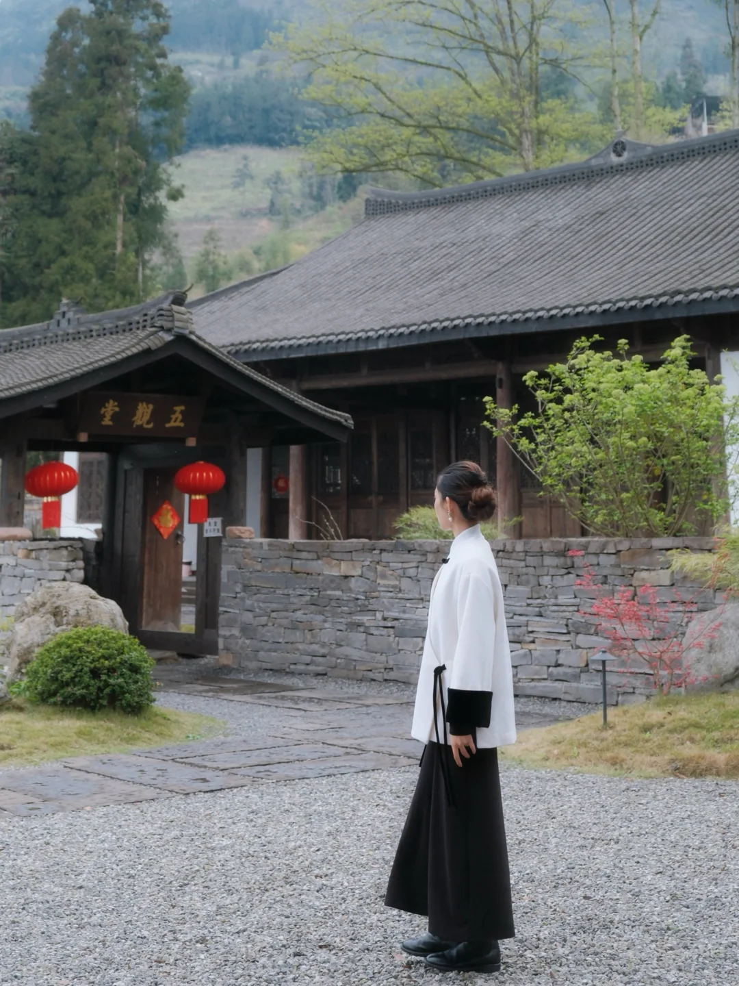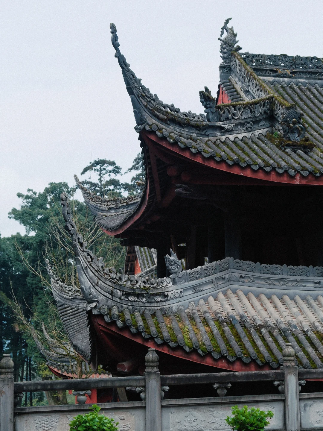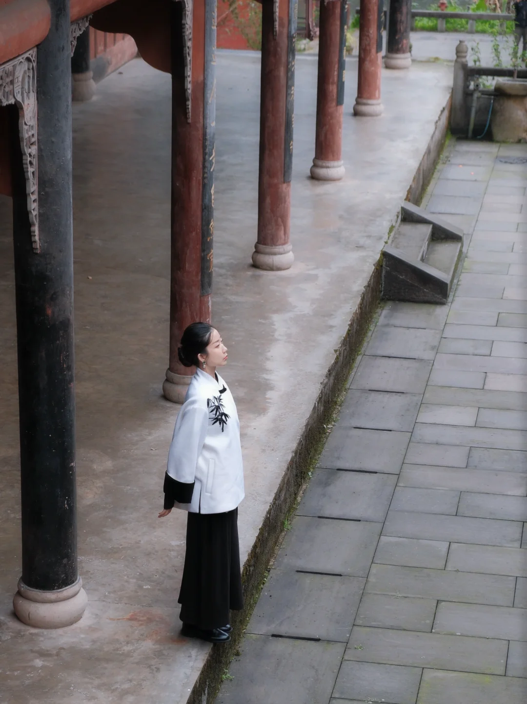 两侧红柱长廊,青苔石阶+盆栽绿植,阴雨天来拍,清冷感绝了!完全是中式美学天花板