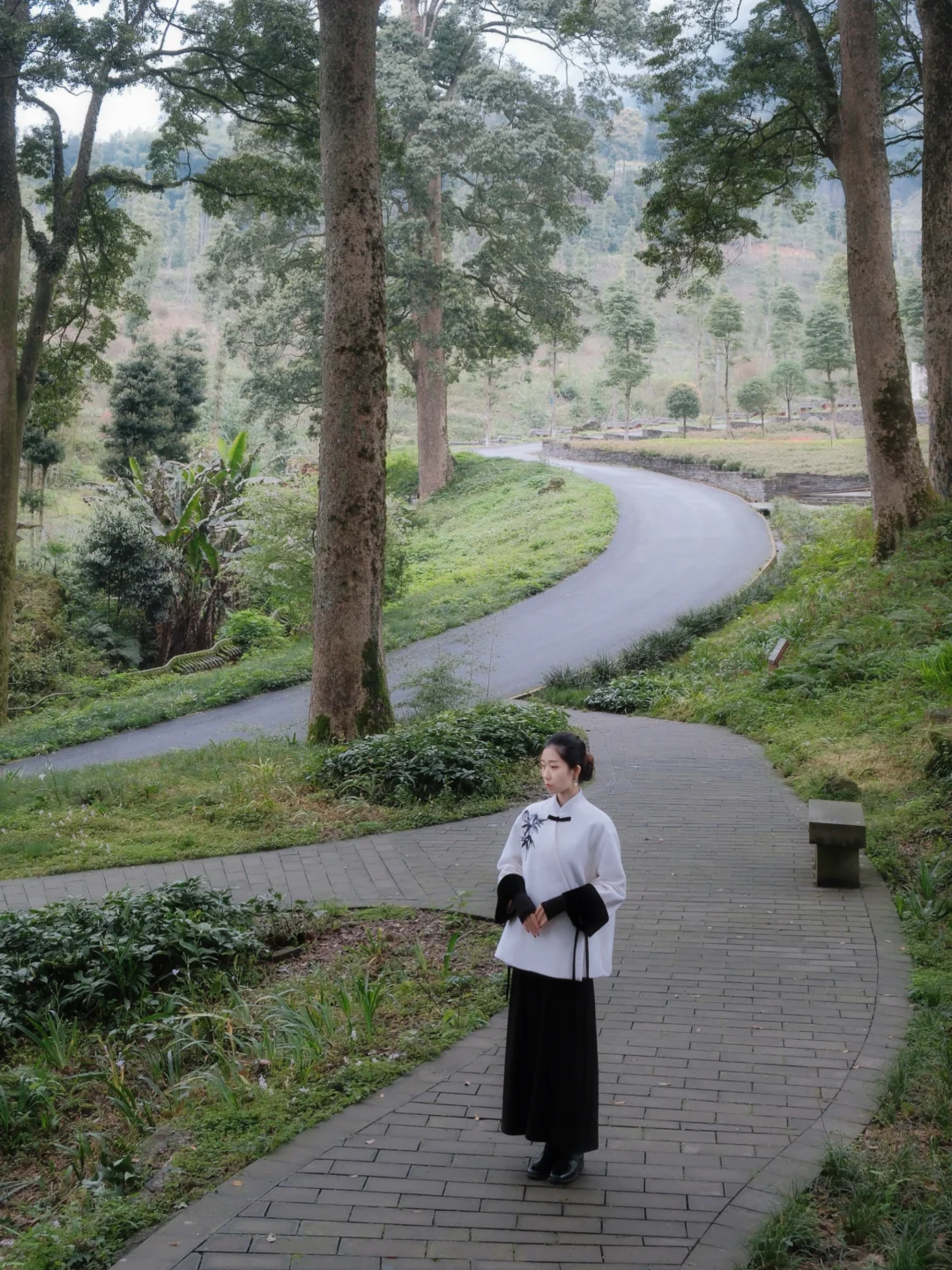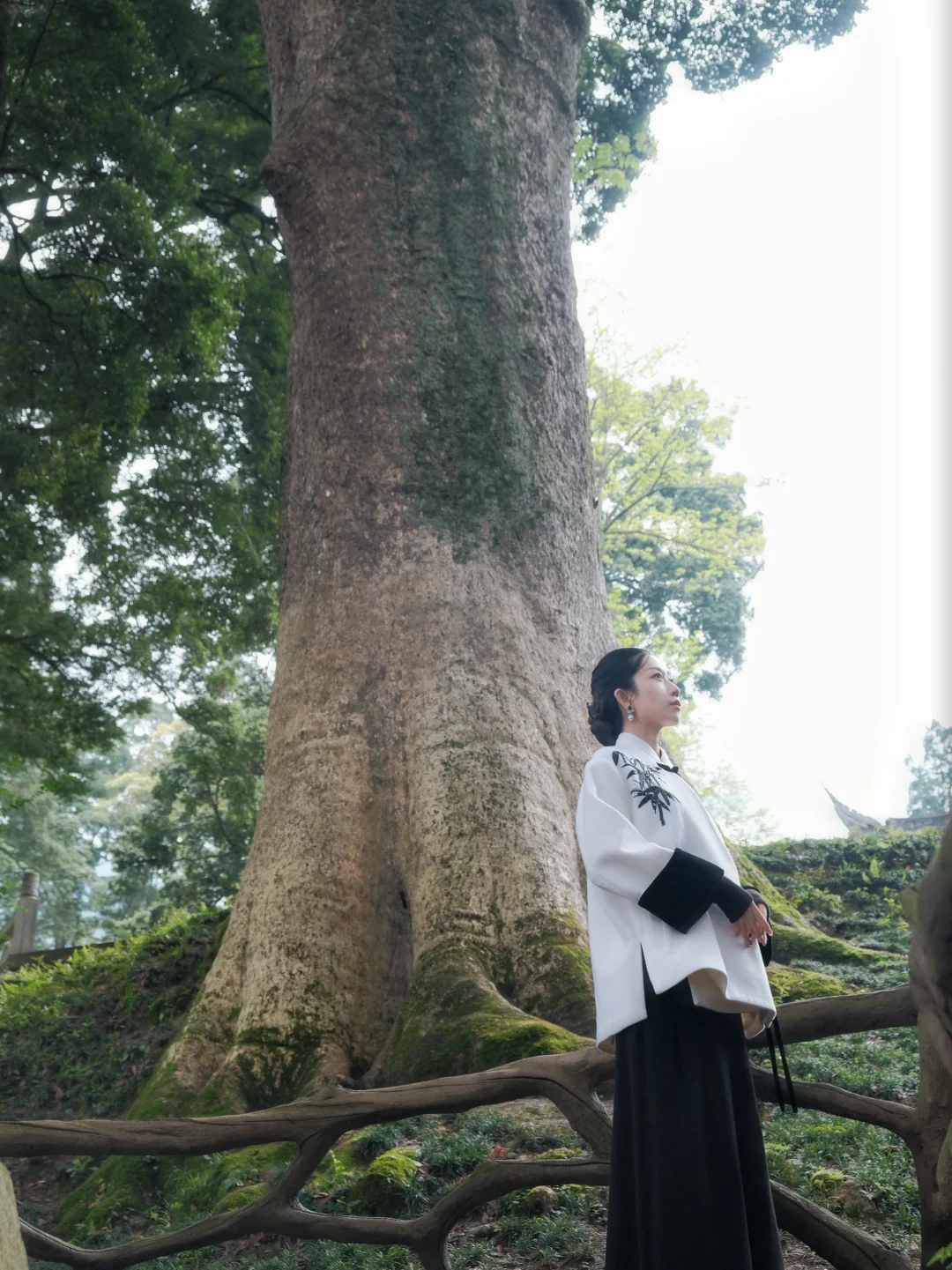 • 桢楠王树下:仰拍+人物侧站,让树叶光斑落在身上