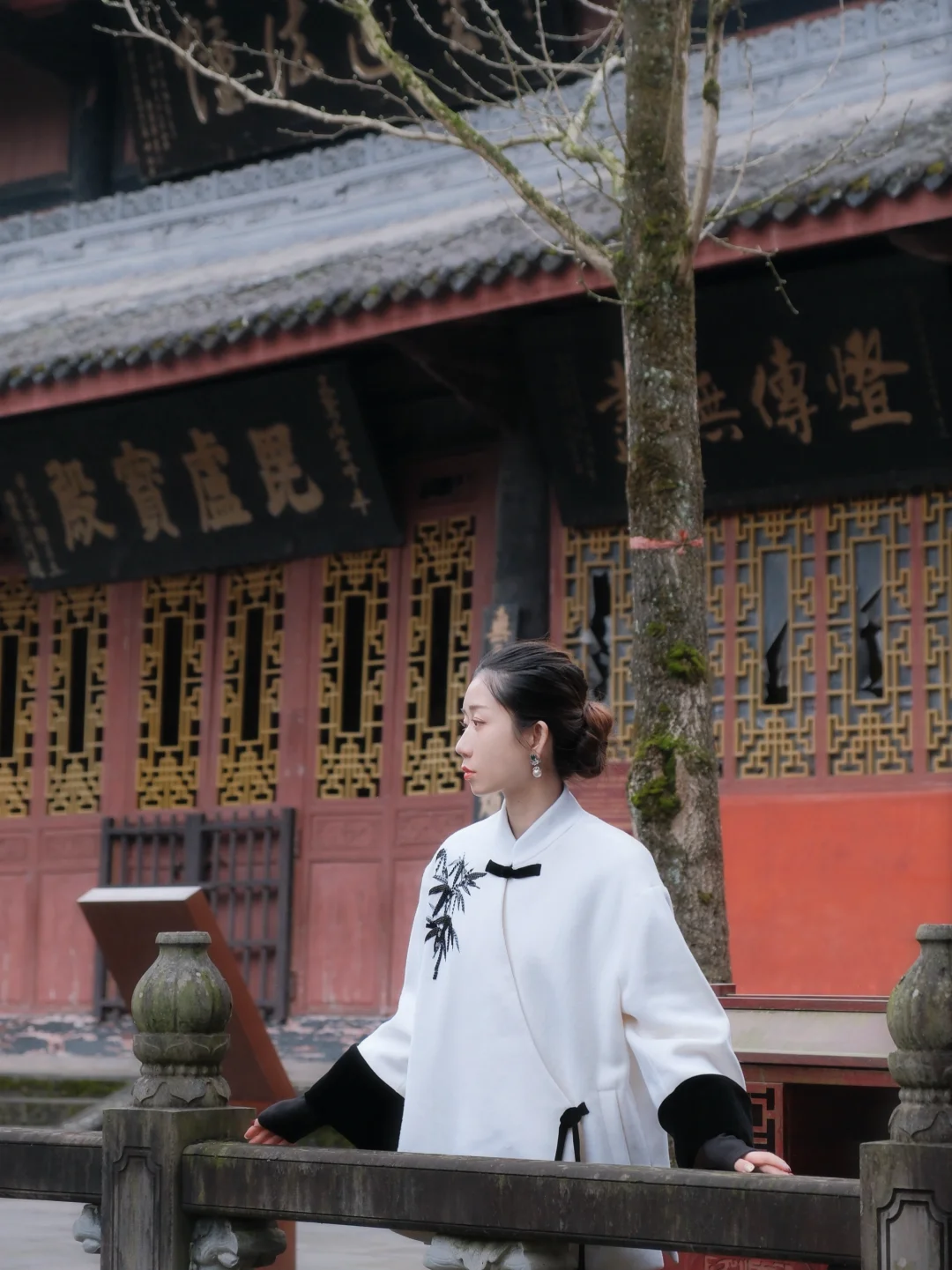 • 大雄宝殿前:飞檐+蓝天/阴天雾感,中式禅意直接拿捏