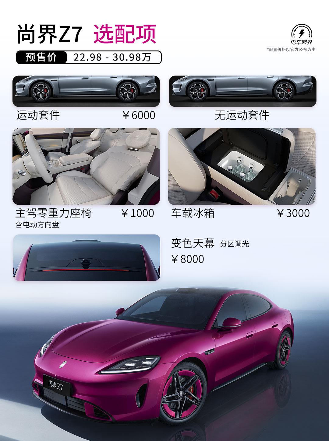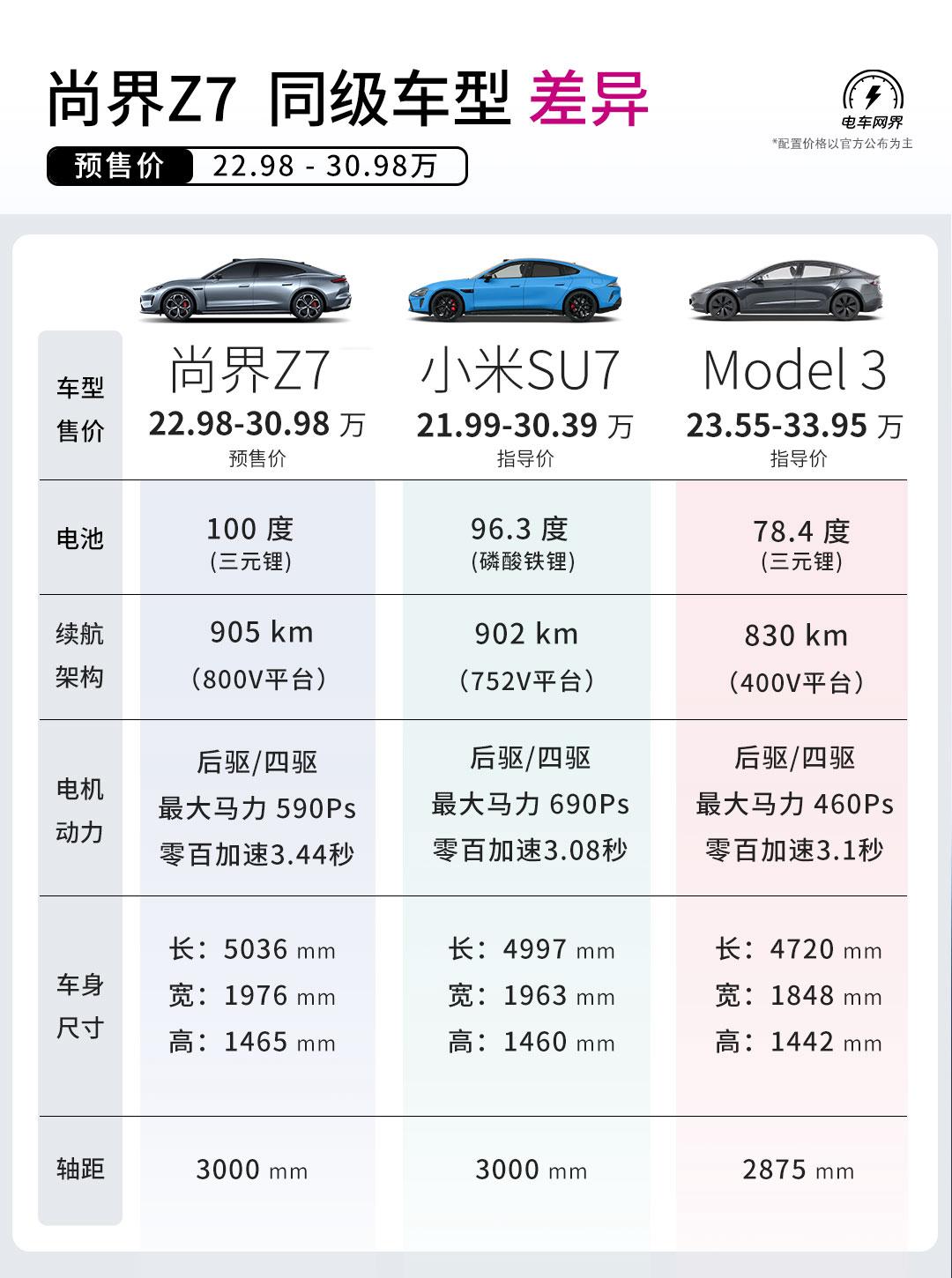 22.98万起,提供3个版本可选,尚界Z7正式开启预售。 简单来说一下尚界Z7的亮点: 提供九款车漆配色,标配紫银蓝三色,电光紫粉色限时免费,其他配色都需要6千选装。四款内饰可选(闪金黑+3千),标配19英寸低风阻轮毂,另外提供5款20英寸轮毂可选配(+6千,含Brembo卡钳),还有运动套件可选。 全系标配896线激光雷达和华为乾崑智驾ADS 4.1,全系标配华为巨鲸800V高压电池平台,其中Max+版CLTC纯电续航905km,底盘上入门版提供CDC可变阻尼悬架,中高配配备了空气悬架+CDC组合,零百加速3.44秒 ,处于同级优秀水平。 相信不用我说,大家都知道Z7的目标用户和小米SU7高度一致,再加上华系智能化的加持,你觉得如果最终卖一样的价格,你更看好谁呢?【来自懂车帝车友圈】