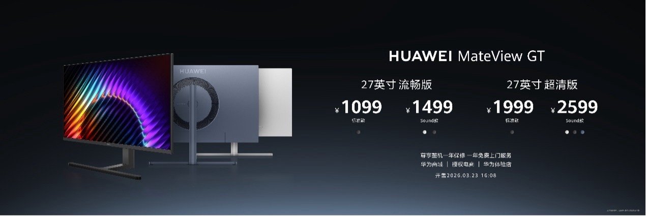 华为发布会华为MateView GT显示器售价1099元起。HUAWEI MateView GT 27英寸超清版Sound款搭载4K云晰柔光屏,具备抗眩光、抗反射及抗指纹性能;拥有91%高屏占比,最高支持4K分辨率160Hz刷新率或1K分辨率320Hz刷新率,覆盖95% P3色域及100% sRGB色域,可呈现10.7亿色的生动画面。音效方面,该显示器支持华为悦彰音效,采用4.1声道,内置5单元扬声器。此外,该显示器还集成多项游戏辅助功能与技术,包括双模刷新率切换、暗阶增强、动态准星及Adaptive-Sync技术,能多方位满足办公游戏等多场景需求。华为春季全场景新品发布会