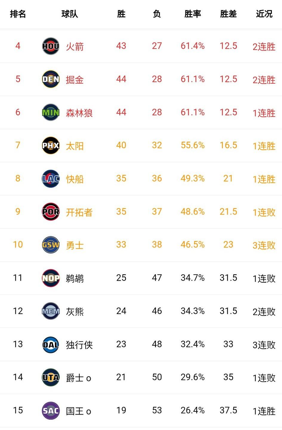 狂野西部!西部前八没有一个输球的。 别看湖人最近状态火热,一看雷霆不知不觉11连胜,还是少了二三当家,真恐怖。 摆烂队也很努力地在输球。除了国王的威少想赢球,9-14名全在输。