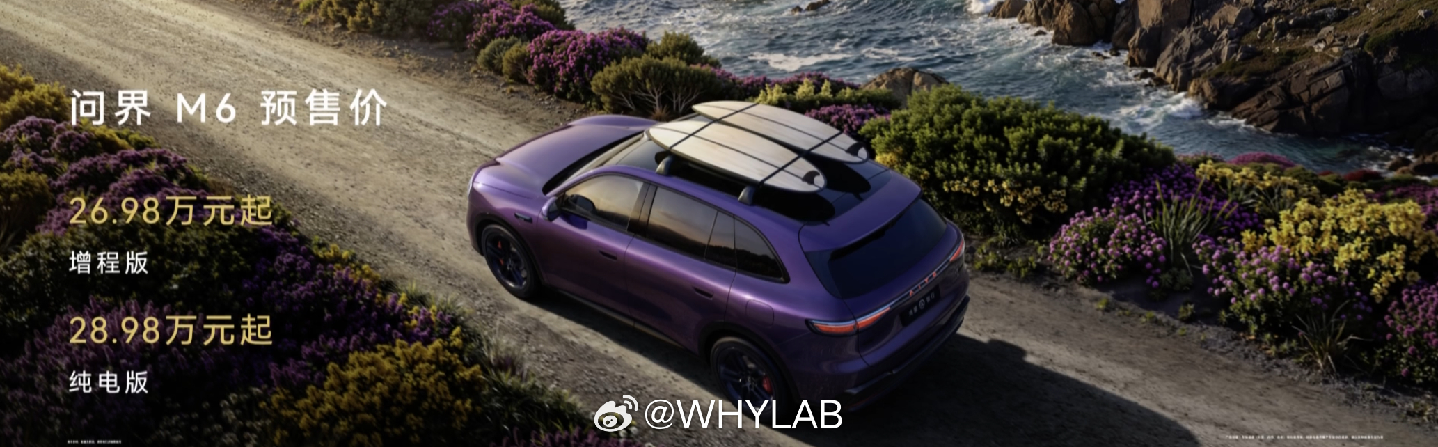 问界 M6 同样全系标配 896 线双光路图像级激光雷达,增程版预售价 26.98 万起,纯电版 28.98 万起。