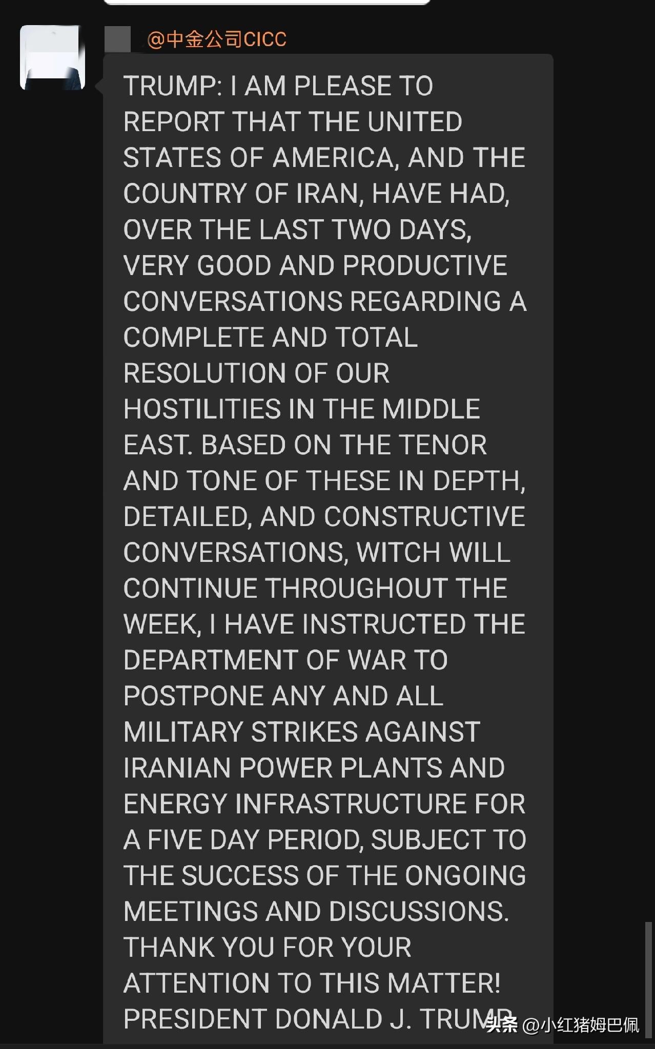 特朗普表示美伊对话取得良好成果,金融市场立刻作出反应:美债收益率,原油价格大幅下跌。目前几乎已经跌回到上周五之前的水准。 如果这样的表态和冲突进展,以及影响本轮市场冲击的核心变量,油价和美债收益率维持到明天。那么明天A股不说全部收回,但也能收回大部分今天的失地。