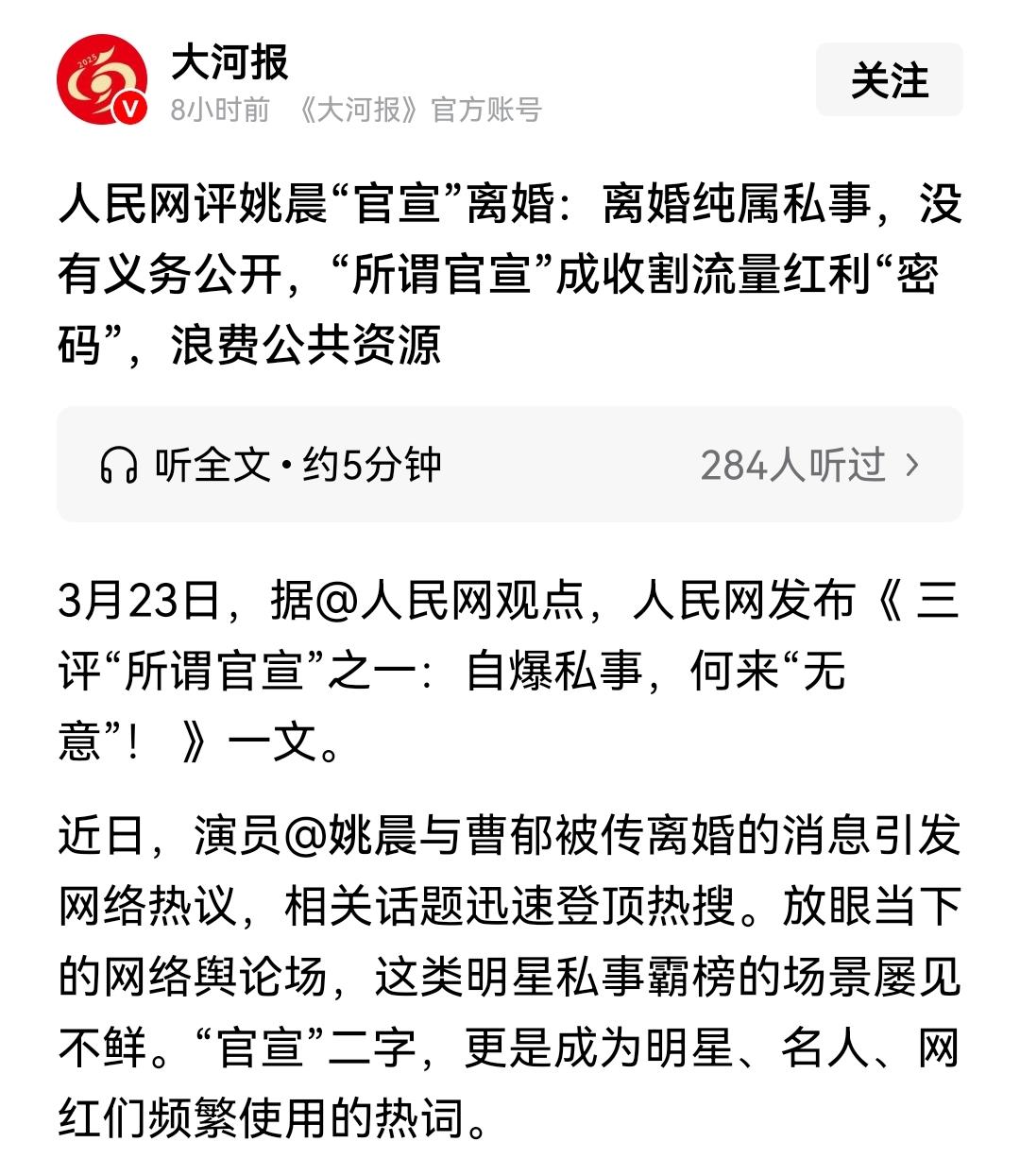 人民网手撕姚大嘴,看得直呼过瘾。我把话放这儿,大伙儿走着瞧。 明明早已离婚,却一直秘而不宣。如今特意发文说明,必然另有所图:要么是另有新欢,怕网友误会,影响品牌代言;要么是新剧宣传,刻意博眼球、炒流量。 演艺圈本就是名利场,艺人所有公开行为,几乎都离不开“名”和“利”。人民网仗义执言,撕下虚伪面具,让大家看清所谓光鲜亮丽背后的真相。 这股歪风邪气绝不可长,建议以此为典型,纳入互联网生态整治行动,以儆效尤。