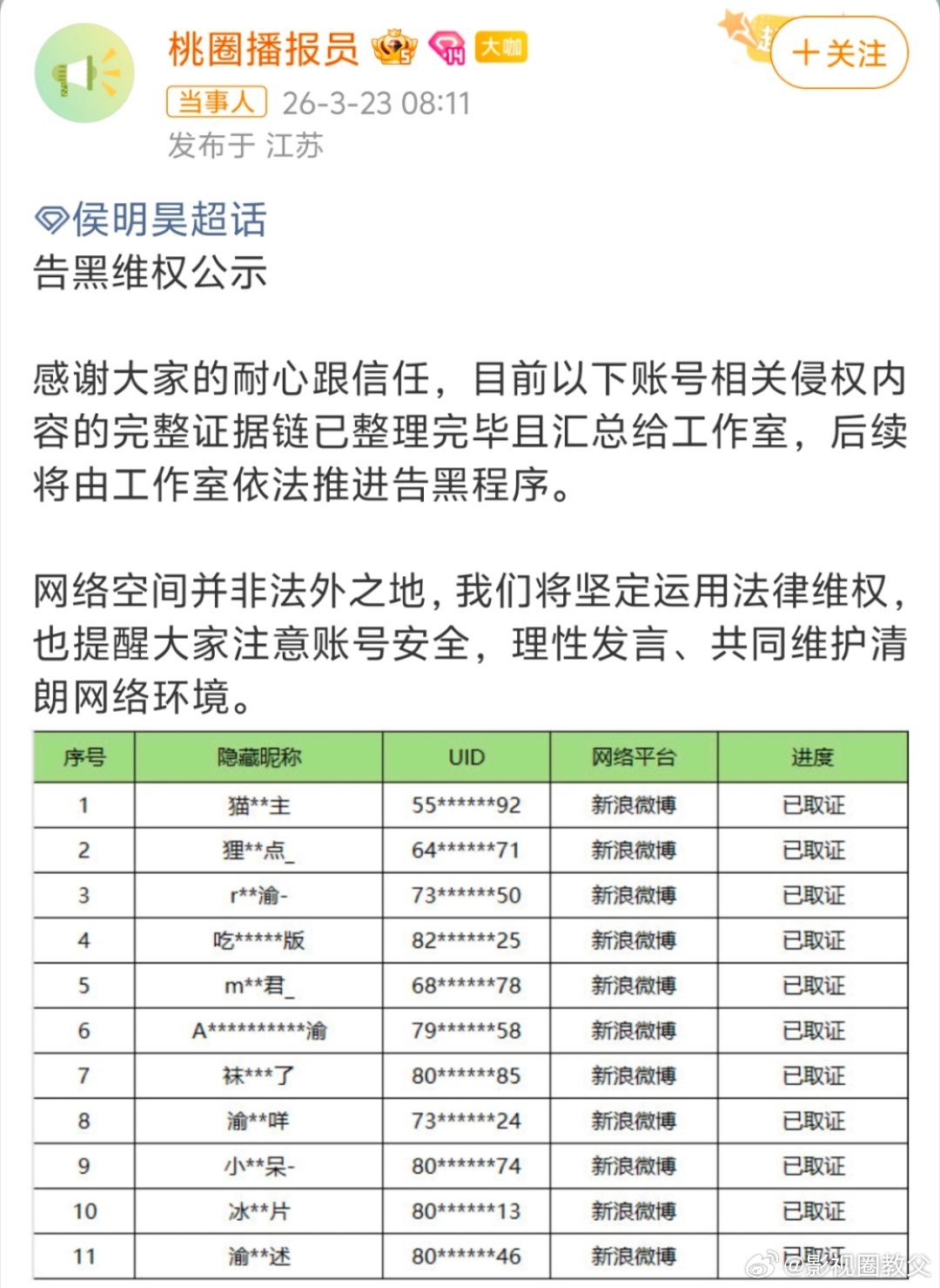 侯明昊告了梓渝粉丝3月23日侯明昊工作室发告黑名单,公示了11个微博账号,全是梓渝粉丝。这些账号涉嫌恶意P图、人身攻击,还冒充田栩宁CP粉挑事,目前已固定证据走法律程序。当天梓渝方也发了反诉声明,说也起诉了侯明昊粉丝,但没公开名单,粉圈互撕和网暴这事直接冲上热搜