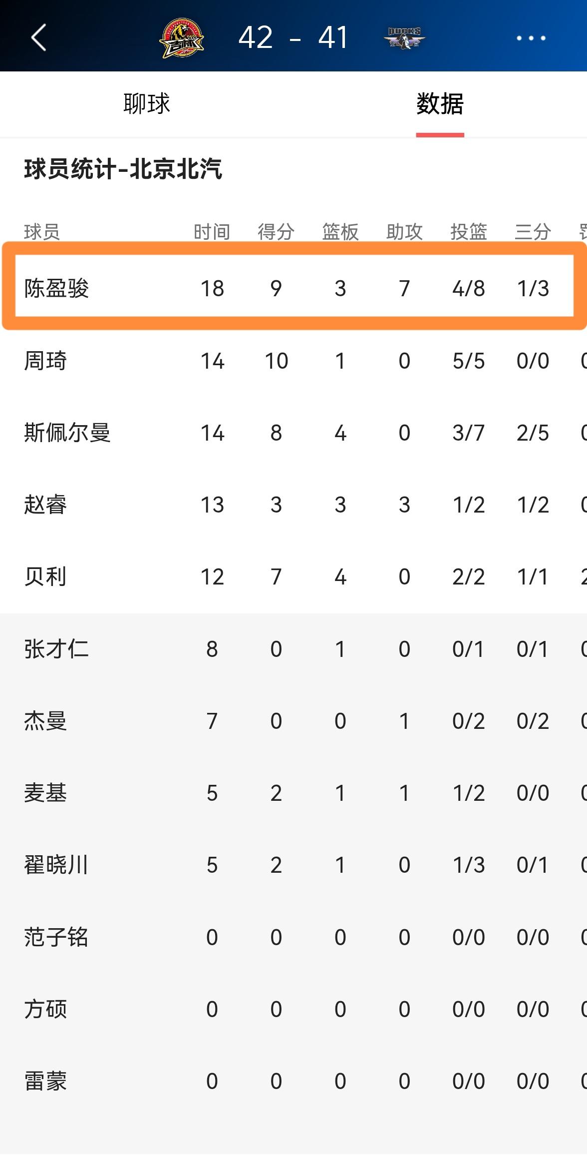 北京北汽球星陈盈骏终于回归正常了!在今天北京北汽客场挑战长白山恩都里的比赛中,目前双方的上半场比赛已经结束,北京北汽以41:42落后对手1分。让人感到非常欣喜的是,在前两节比赛中,陈盈骏终于回归正常水平了,他在首发出战的18分钟里,投篮8中4,其中三分球3中1得到9分,还有3篮板7助攻,没有出现任何的失误,他的场上正负值为+4。 虽然北京北汽暂时处于落后,但是那个既能得分又能传球的陈盈骏总算回来了,这对于北京北汽来说绝对是一个好消息。