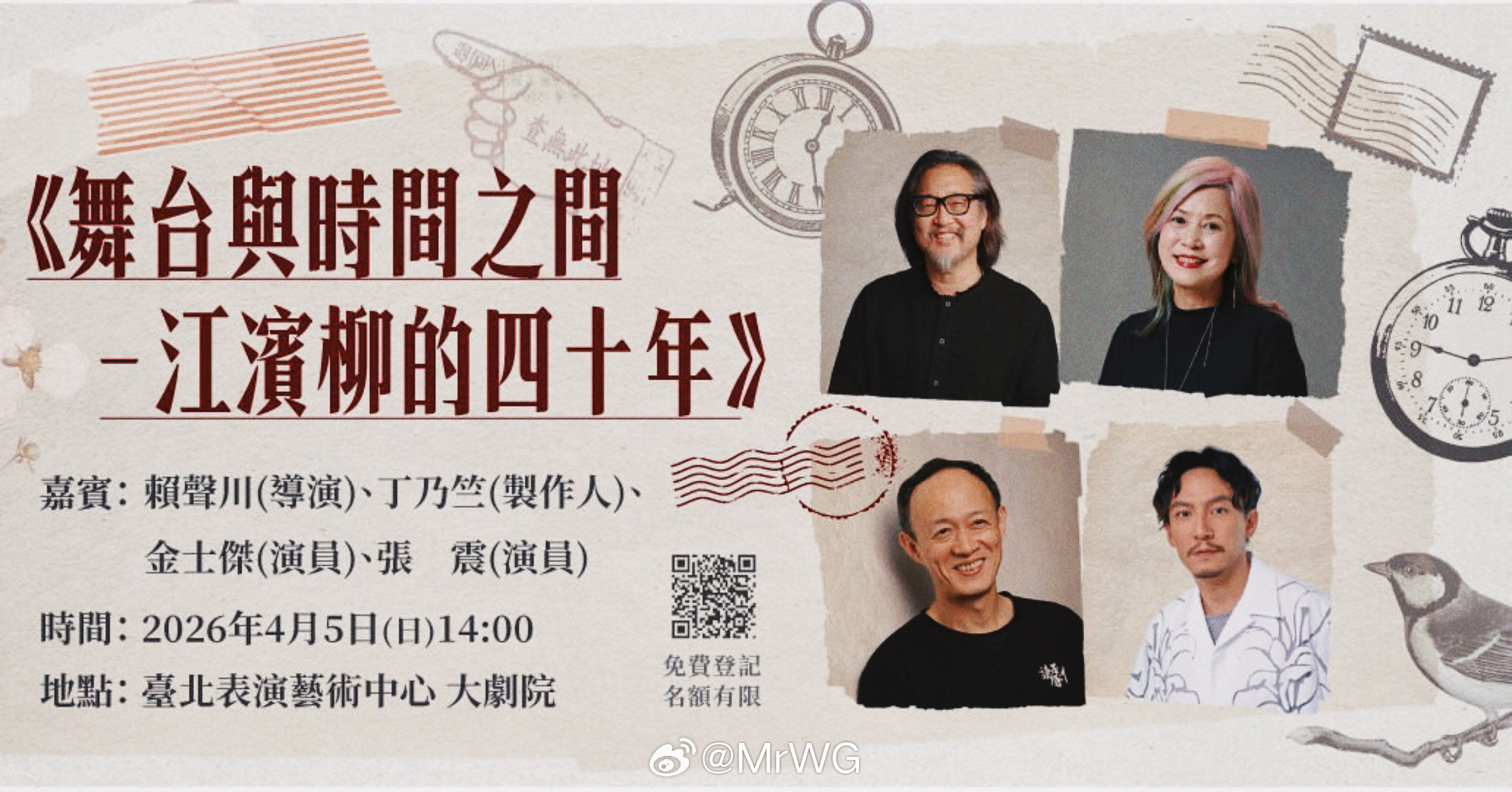 MrWG影讯很想听! 【🖼️《江/云 · 之/间》|“舞台与时间之间── 江滨柳的四十年”讲座🖼️ 】两代“江滨柳”,金士杰、张震张震 ,与赖声川、丁乃竺导演夫妇,一起对谈这个《暗恋桃花源》的角色。暗恋桃花源