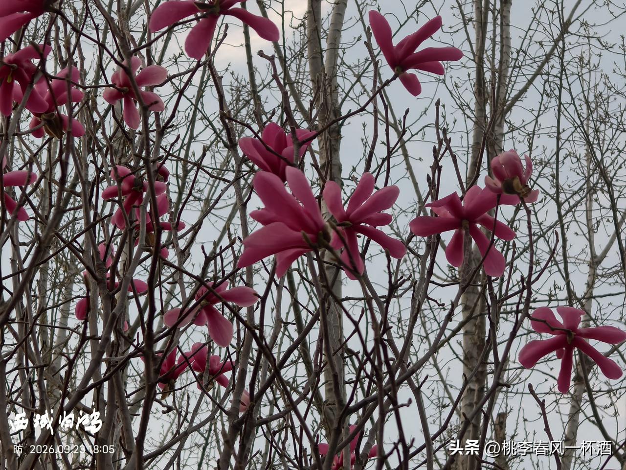 分享一张开花的照片枝头的玉兰花如梦幻般摇曳,灰暗的枝干上开着鲜艳的花,灰暗鲜明形
