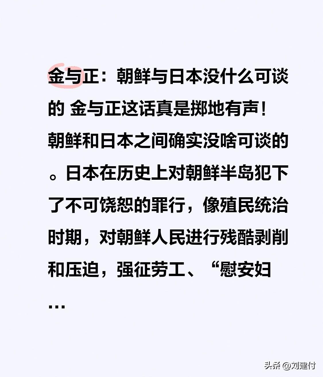 金与正:朝鲜与日本没什么可谈的 金与正表示:朝鲜与日本没什么可谈的。金与正此言掷地有声!朝鲜和日本确实没什么可谈的。 日本在历史上对朝鲜半岛犯下不可饶恕的罪行,殖民统治时期,残酷剥削和压迫朝鲜人民,强征劳工、“慰安妇”等恶行罄竹难书。 如今,日本在国际事务中的一些做法也令朝鲜不满。军事上,日本不断扩充军备,还与美国搞小动作,威胁到朝鲜安全。 朝鲜向来强硬,金与正这番表态,表明朝鲜不会在原则问题上妥协,也让日本知道别想轻易在朝鲜占到便宜,这态度太飒了!