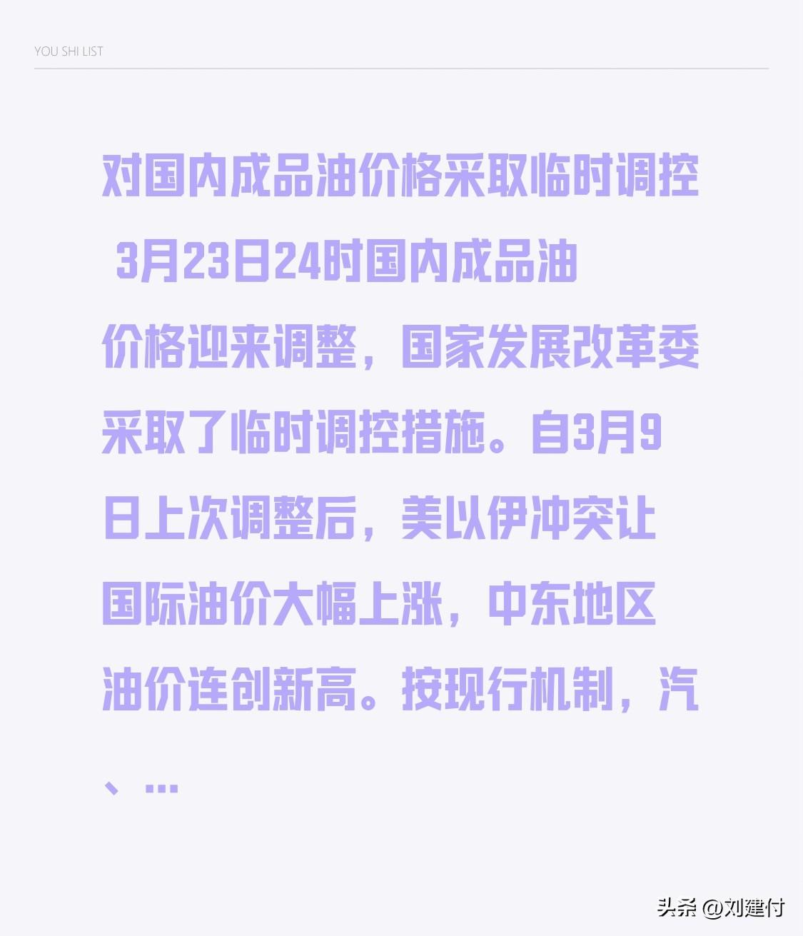 对国内成品油价格采取临时调控 3月23日24时,国内成品油价格迎来调整,国家发展改革委对国内成品油价格采取临时调控措施。自3月9日上次调整后,美以伊冲突致使国际油价大幅上涨,中东地区油价连创新高。按现行机制,汽、柴油每吨应上调2205元、2120元,调控后实际仅上调1160元、1115元,折合成升价每升少涨约0.85元。 这是2013年现行机制实施以来的首次调控。国家出手减缓了国际油价异常上涨带来的冲击,减轻了下游用户负担,保障了经济和民生。后续还将保障供应、维护市场秩序,此次调控及时有力!