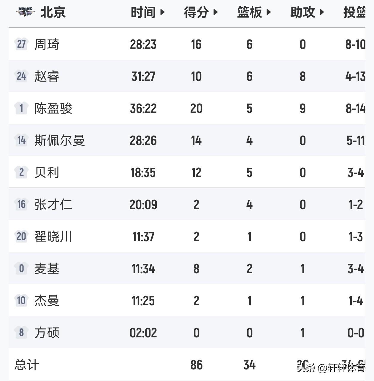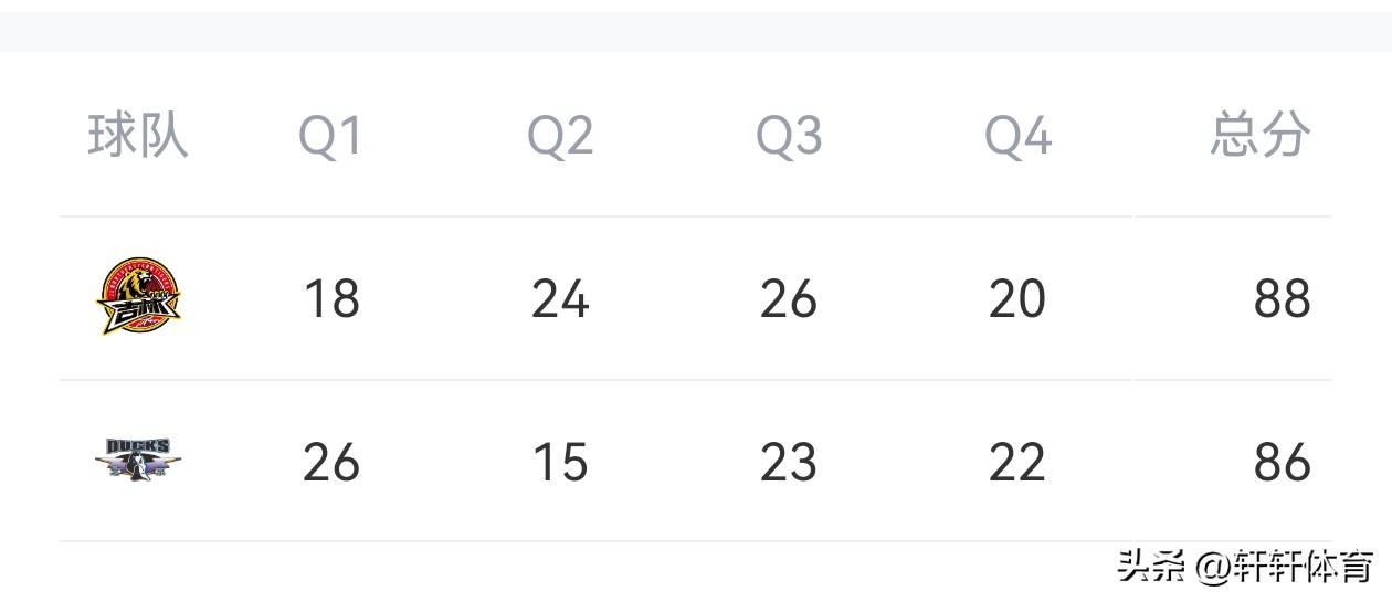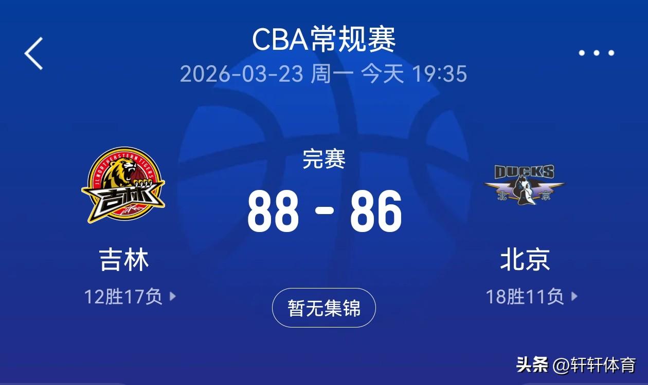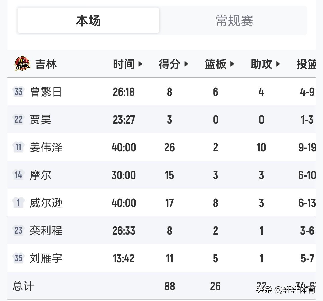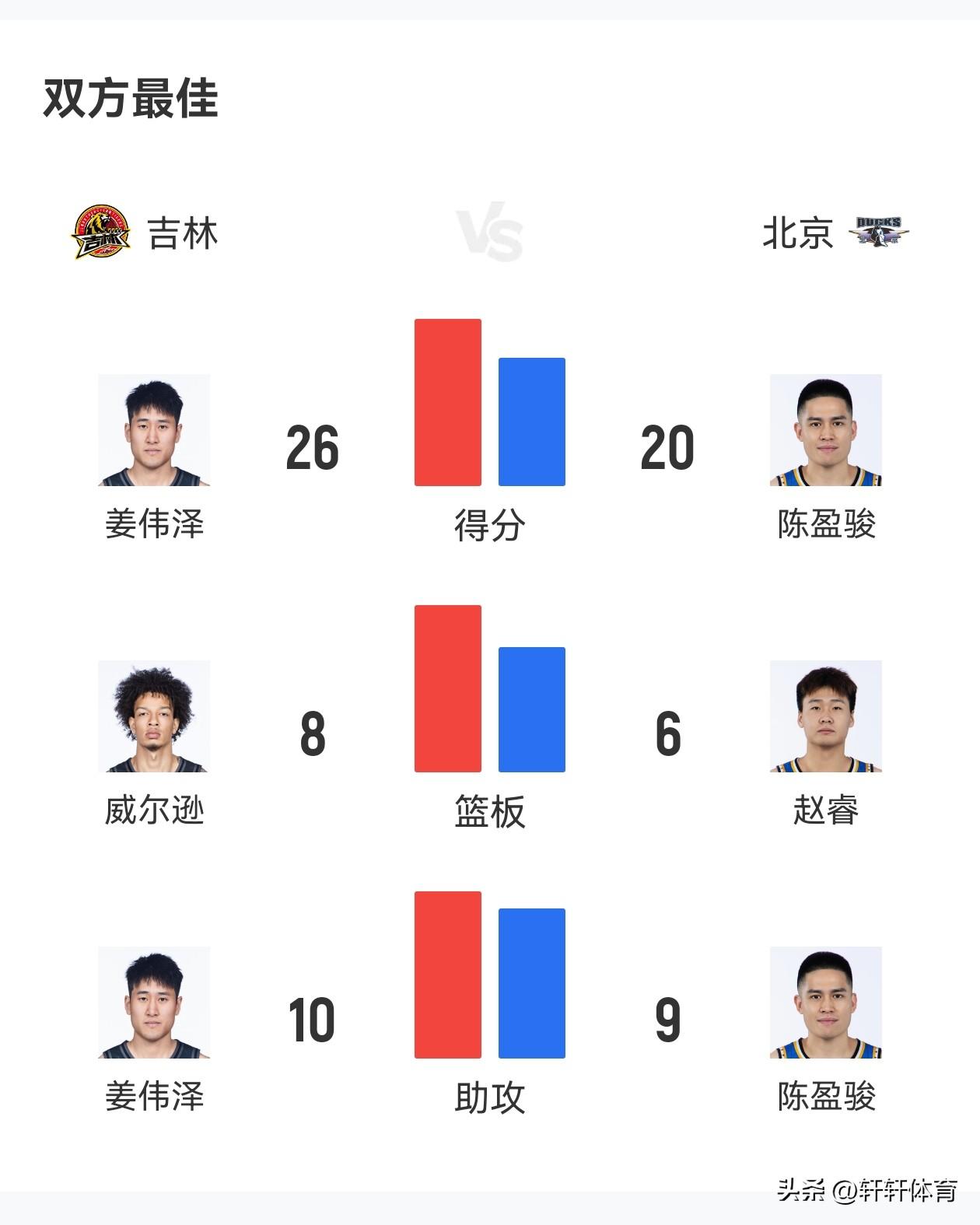 爆冷!爆冷!爆冷!本轮CBA常规赛爆出最大冷门,坐镇主场的吉林男篮在姜维泽超神发挥的情况下带领球队以88-86战胜北京北汽男篮,本场比赛开场北京男篮就以7-0拉来进攻节奏,曾繁日的暴露帮助吉林男篮拿到首分,随后北京男篮快速将比分优势扩大到两位数,姜伟泽首节就开启得分模式,连续的三分命中帮助球队紧追比分,首节比分主场作战的吉林男篮以18-26落后北京男篮8分,次节比赛开场北京男篮命中率突然哑火,周琦连续4次罚篮不中,吉林男篮抓住机会给北京男篮来了一波15-0的反击高潮,虽然陈盈骏的发挥帮助北京止住颓势,但是半场比赛结束吉林男篮以42-41反超北京男篮1分,下半场虽然北京男篮奋起反击,但吉林男篮姜伟泽以及摩尔能够及时给予回应,随着周琦三分绝杀不中,吉林男篮主场爆冷88-86击败北京男篮,整场比赛除了吉林男篮确实发挥出色外,北京男篮的轻敌以及战术布置存在巨大问题,尤其最后时刻的绝杀周琦来三分执行,周琦全场罚球8罚0中就能够看出手感冰凉,为什么不用陈盈骏来执行绝杀,本场比赛吉林男篮姜伟泽高效贡献了26分2篮板10助攻的两双数据,两外援合计砍下了32分,吉林男篮替补11分5篮板入账,北京男篮陈盈骏拿到了20分5篮板9助攻的准两双数据,周琦16分6篮板,麦基8分2篮板1助攻。
