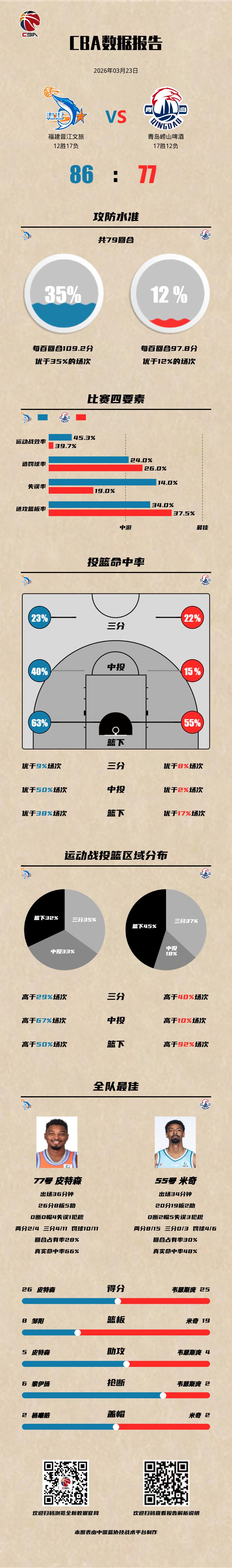 福建晋江文旅 86-77 青岛崂山啤酒 福建男篮vs青岛男篮 福建晋江文旅:皮特森22分7篮板5助攻,马昆杜18分6篮板,邹阳8分6篮板; 青岛崂山啤酒:韦瑟斯庞23分4助攻2抢断,米奇18分14篮板,赵嘉义10分4篮板。以城之名