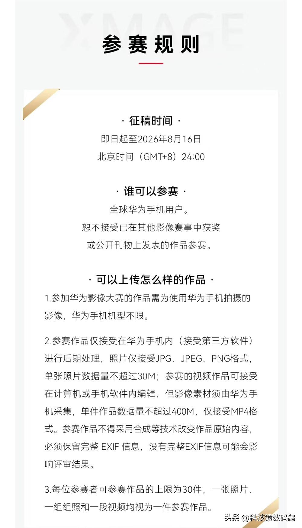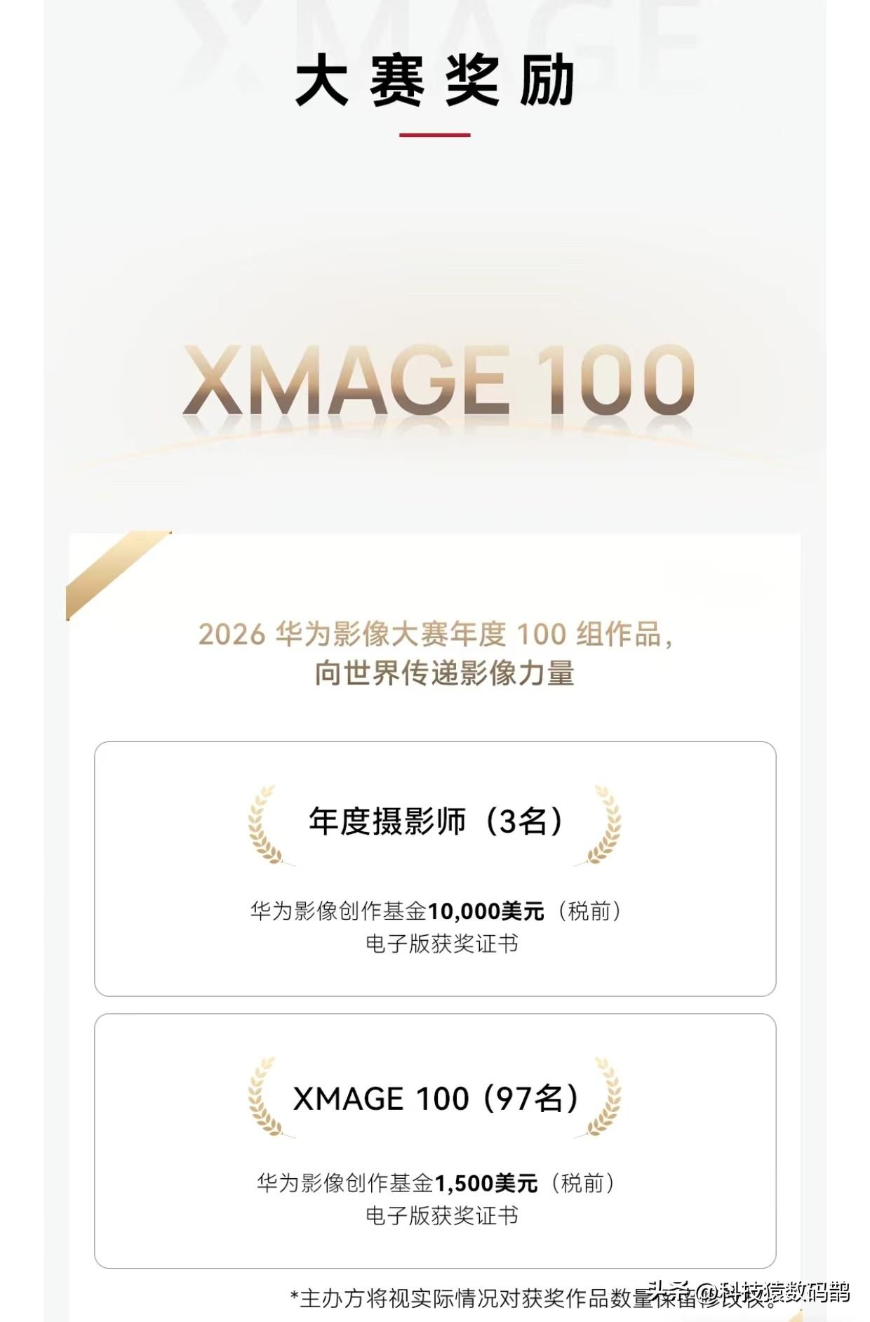 所有华为手机用户请留步❗❗ 华为2026年影像大赛(XMAGE Awards)正式开启,全球开赛,前三名奖金每人:10000美元(税前),剩下的97人,每人1500美元(税前),喜欢摄影,爱拍视频,爱拍照、会拍照,会拍视频的华为设备用户赶紧来报名参赛,错过,多等一年,详细的流程我给大家写在下面: 1、征稿时间:2026年3月23日——2026年8月16日24时结束。 2、参赛资格:全球所有华为手机用户,不限手机型号,只要是华为手机拍摄的作品就可以参赛,每个人最多可以拿30个作品参加评选。 3、参赛作品只接受在华手机内(接受第三方软件)进行后期处理,照片格式只能为JPG、JPEG、PNG,单张照片大小不能超过30M。 4、参赛的视频作品可接受在计算机或手机软件内编辑,但影像素材须由华为手机采集(注意画面内容必须是由华为手机拍摄),单件作品数据量不超过400M,仅接受MP4格式, 5、参赛作品不得采用合成等技术改变作品原始内容,必须保留完整 EXIF 信息,没有完整EXIF信息可能会影响评审结果。 6、普通用户参赛途径,从华为手机图库,选择要参赛的作品,然后直接点击分享至我的华为APP就可以了,超简单。 有艺术细胞,眼光好,喜欢用手机记录美好生活瞬间的朋友,赶紧选择一张自己心动的照片和一段自己拍摄的视频赶快来参赛吧!万一真的中奖了呢,这可是机不可失时不再来的机会呢。祝大家好运[烟花][烟花][烟花][锦鲤到来]华为全球总决赛 华为影像活动