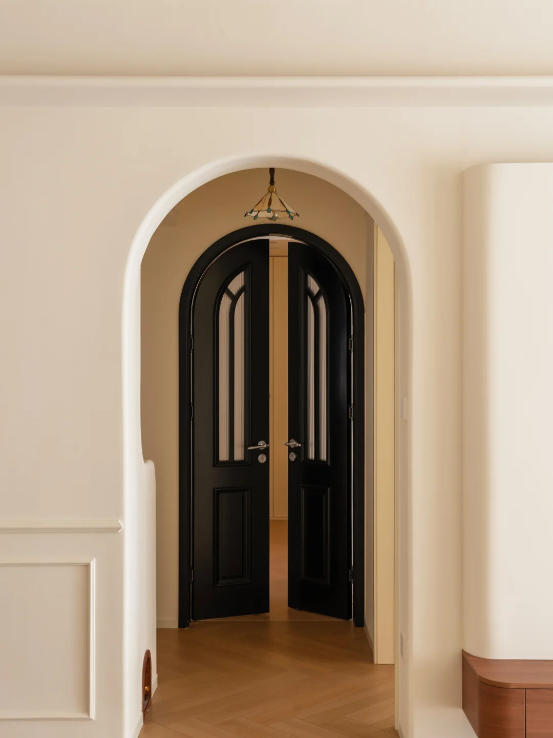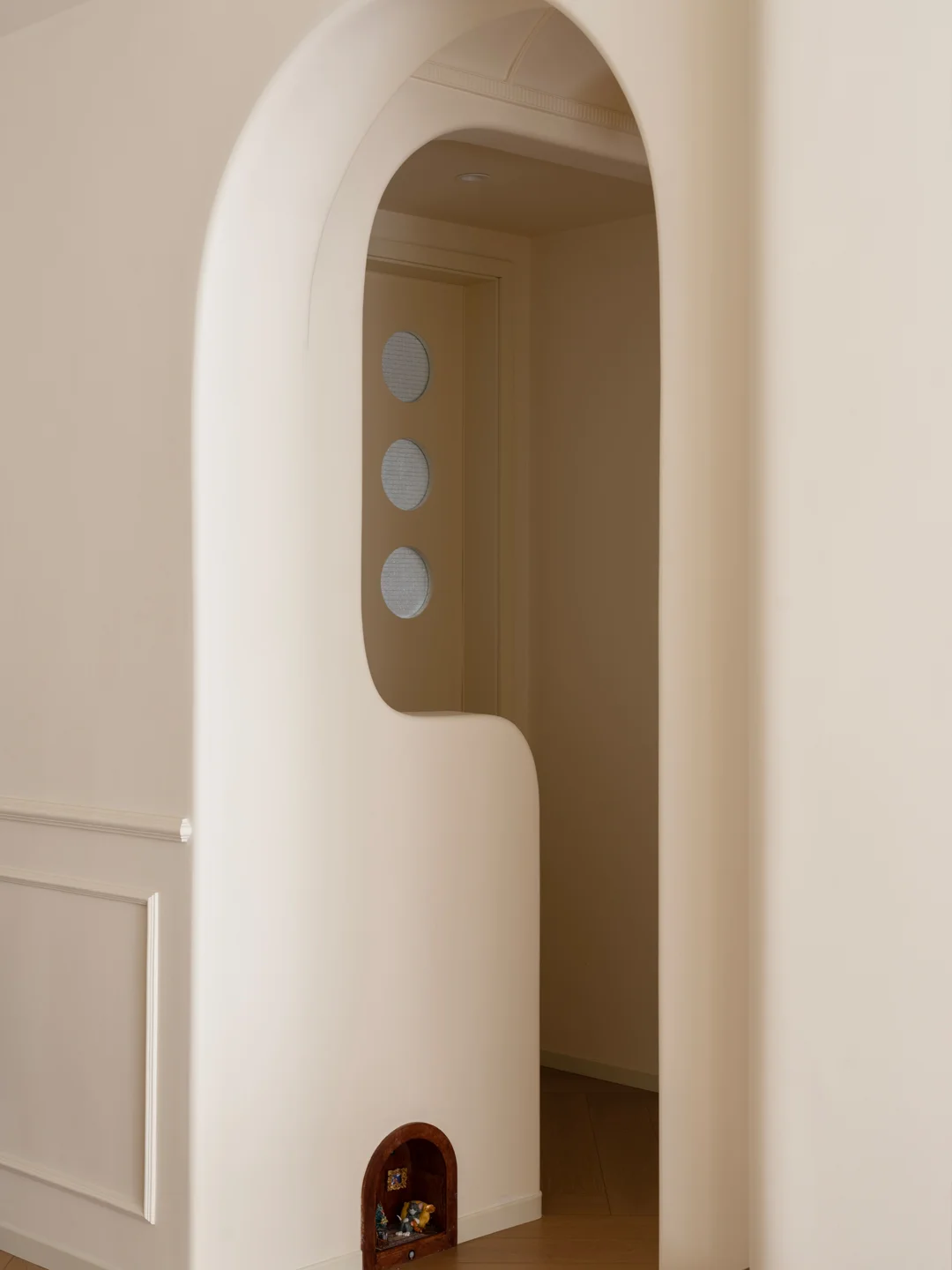 装修不妨大胆一些,在这个家里大量采用弧形造型。矮墙的弧形阳角,同时墙体两侧的直角边也做了小圆弧处理,进入过道的天花处做了拱形门洞,搭配处一个柔和有艺术性的空间。