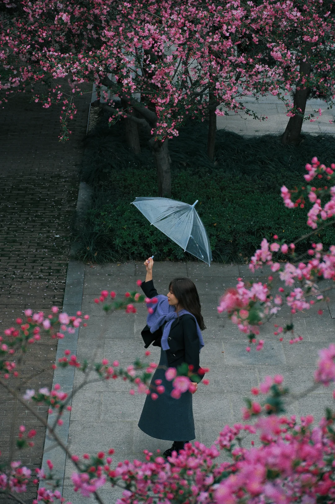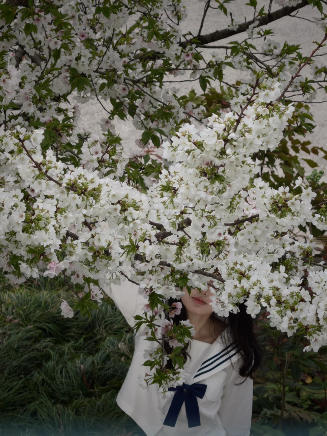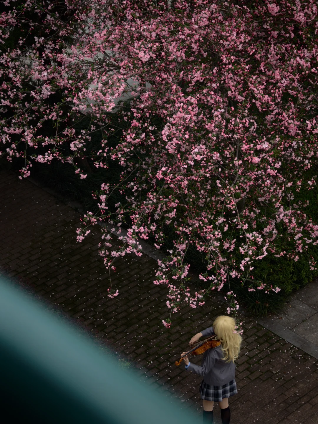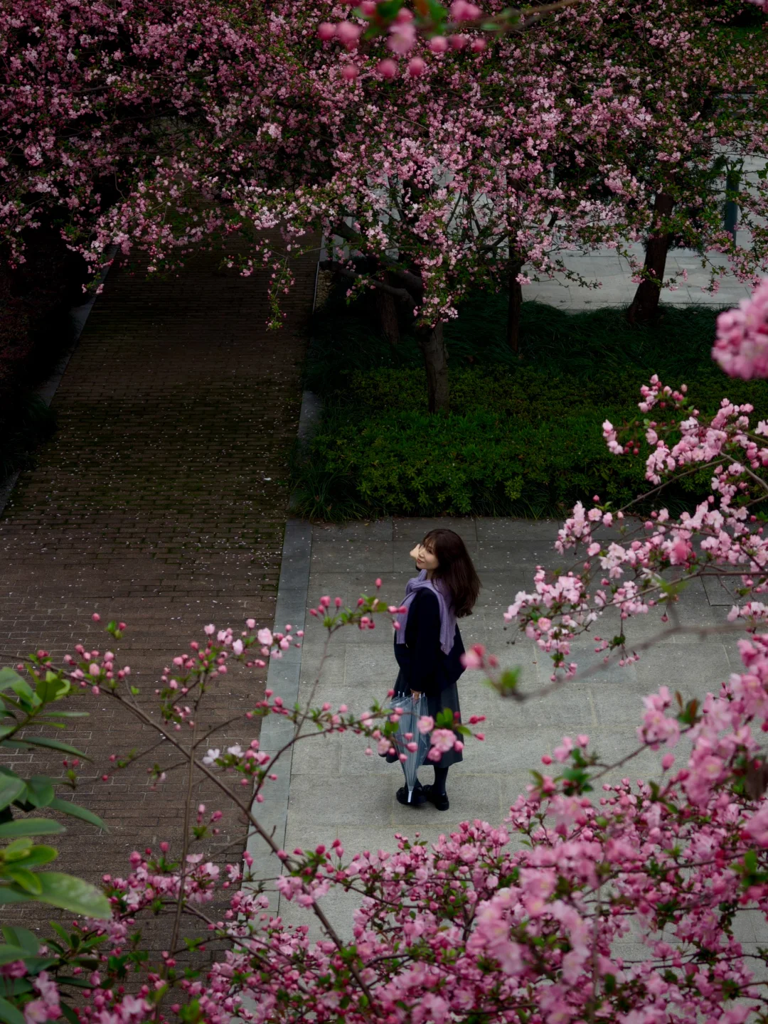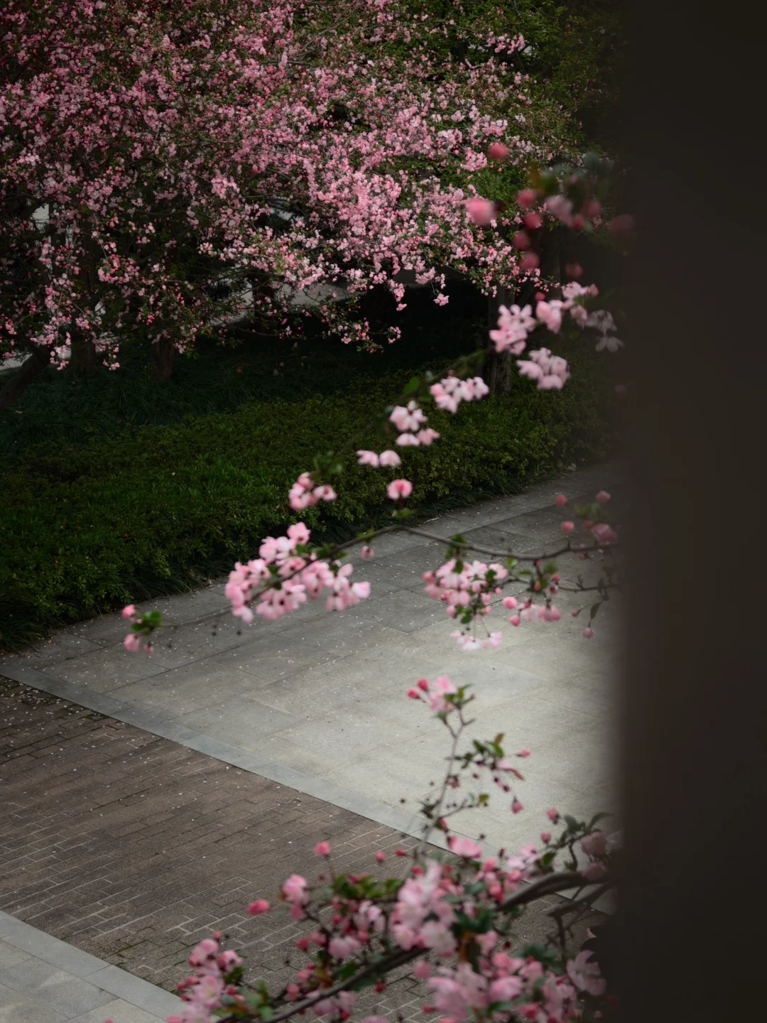 • 俯拍:站台阶/栏杆边,拍落樱与草坪,温柔满分