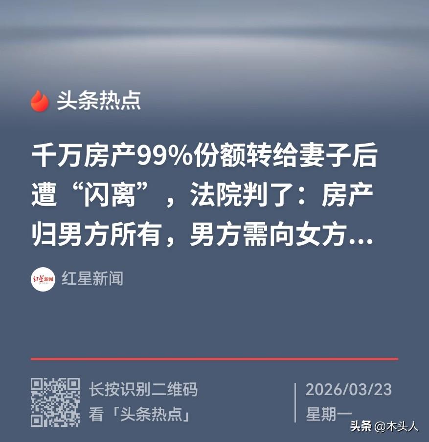 “洗房失败!”上海,女子和小自己13岁的男子结婚,说自己女儿想换更好的学校读书,男子说服父母把家里一套价值千万的房子过户给了他。4天后,男子在父母不知情的情况下,把房子99%的份额给了妻子,可两人在一起生活不到6个月,女子起诉离婚。离婚6个月后,女子又要求分割房产,可法院判决让她傻眼。 36岁的李某和第一任丈夫离婚后,独自带着一个女儿生活。 2018年3月,她坐顺风车时,遇到了23岁的小刘,两人一路上相谈甚欢,分别时还互相加了联系方式。 之后李某对小刘嘘寒问暖,很是善解人意,两人认识不到一个月,就确定了恋爱关系。 2019年1月,两人登记结婚,可这结婚有些草率,双方父母并未见过面,两人也没举办婚礼。 婚后,两人并没有像新婚夫妻一样住在一起,而是依旧各自住在各自父母家里。 之前小刘父母的老房子拆迁,他们分得了两套房子。 其中一套大房子写着小刘及其父母的名字,由他们一家三口居住,小房子出租。 婚后不久,李某跟小刘说,想给自己女儿换到更好的学校,能不能把女儿的户口迁到小刘家。 小刘对李某女儿视如己出,很是很重,他劝父母把价值千万的大房子过户给了自己。 之后,小刘又瞒着父母,把房屋进行变更,加上了李某的名字,双方约定:李某占有99%的房产份额,小刘只给自己留了1%。李某缴纳了变更的11.9万元税费。 小刘诚意满满,李某被打动,两人一起去外面租了房子,像夫妻一样居住生活。 但是好景不长,两人共同生活不到6个月,李某从租房搬走,两人分居。 之后,李某2次起诉离婚,均未要求分割夫妻共同财产,只求快点离婚。 两人离婚后,就在小刘以为一切风平浪静,自己可以好好生活时,李某却一纸诉状将他告上了法庭。 李某主张:99%的房产份额是小刘赠予给自己的,赠予已经完成,她要求按照房产证上的产权份额分割房产。 这可把小刘一家急坏了,他们家最值钱的就这两套房子,如果这套房子被李某拿走,两个老人可能落得无家可归的下场。 并且,他们家获得这套房子的时候,小刘才13岁,对房子的取得根本没什么贡献,李某也没有在这套房子上出过力。 小刘当初为了李某和她的女儿,那么真心实意地付出,把房子大部分产权都给了李某,可李某却在离婚后,为了这套房子和小刘一家闹得不可开交,这多少有点让人心寒。 感情不是用来算计和争夺财产的工具,可李某却不谈自己和小刘的感情,只要房子。 单从房产证来看,李某确实享有99%的份额,小刘只有1%,但是法院从房屋来源,双方婚姻等多方面入手,作出了公正判决! 《民法典》第1065条规定:‌男女双方可以约定婚姻关系存续期间所得的财产以及婚前财产归各自所有、共同所有或者部分各自所有、部分共同所有。约定应当采用书面形式。 法院查明小刘将99%的房产份额转给李某时,双方并没有正式的书面约定,也没有充分协商过。 小刘将房产份额转给李某,也是为了让两人的婚姻走的更长久,是出于对李某女儿的善意,才将房屋份额转给李某的。 这套房子是小刘父母的老屋拆迁来的,家里取得这套房子时,小刘13岁,对房屋并无任何贡献。 李某从事房地产相关工作,也明知道这套房子的来源,但是她并未跟小刘父母沟通,也没有提前小刘应该跟父母商量,这对于小刘一家来说,是不公平的。 小刘父母在两人婚姻存续期间,把房子通过赠予合同的方式给到小刘,这套房子是小刘的个人财产。 《民法典》第1063条第3项规定:遗嘱或者赠与合同中确定只归一方的财产,为夫妻一方的个人财产。 李某和小刘相识不到10个月,在没有见过父母的情况下,登记结婚,也没有举行任何仪式,两人结婚3年多,可在一起共同生活的时间不到6个月,离婚后,李某不谈感情,只谈房子。 最终,法院综合多方因素,判决房子归小刘所有,小刘支付50万房屋折价款给李某。 李某不服,提起上诉,二审维持原判。 男女恋爱,涉及到金钱往来和房屋过户时,一定要考虑清楚,一旦签订赠与协议,完成过户,想要回来还是很难的。 小刘能拿回房子的几个关键点:他和李某并未签署任何赠与的协议,双方没有书面约定,小刘和李某对房屋都没有贡献。 另外,两人共同生活时间短,且小刘无重大过错,所以给了50万折价款给李某,把房子要了回来。 对此,你怎么看?