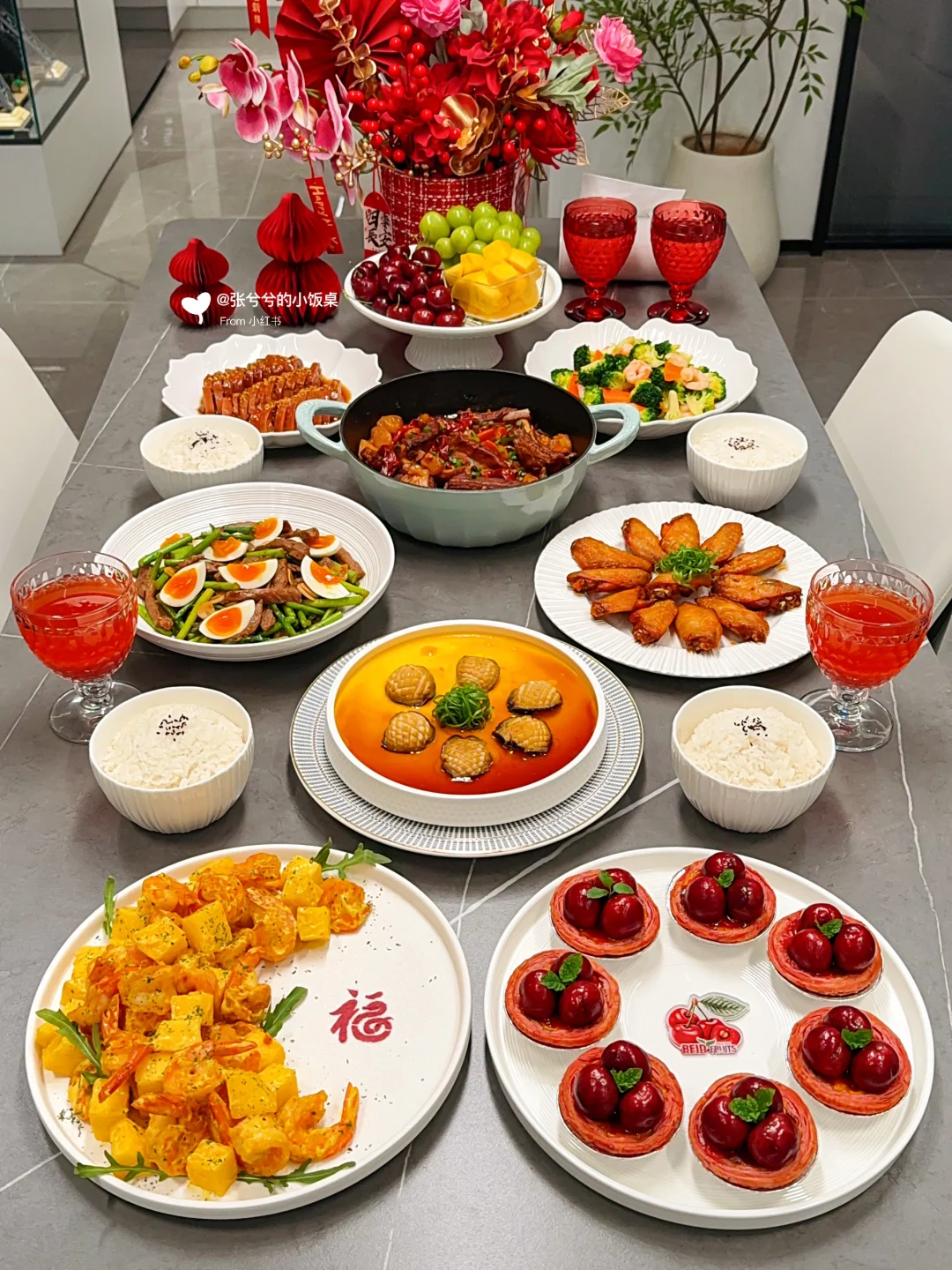 图2️⃣:红烧排骨➕鲍鱼蒸蛋➕芒果芥末虾球➕芦笋牛柳溏心蛋➕车厘子蛋挞➕奥尔良烤翅➕桂花糯米藕➕西兰花炒虾仁
